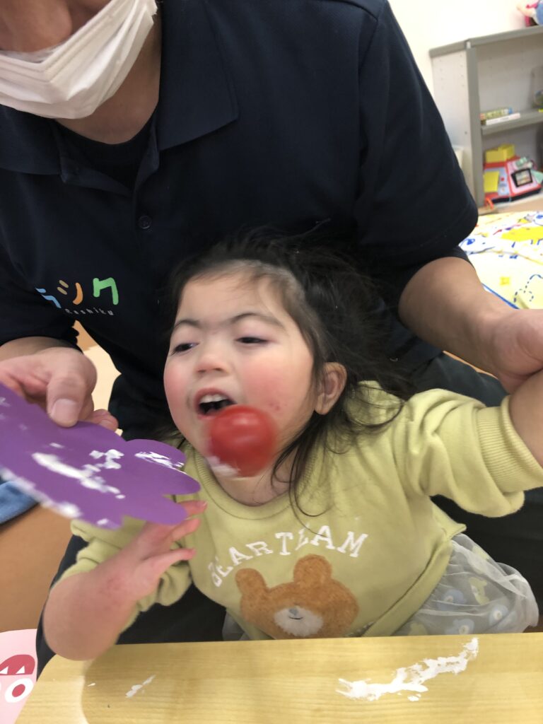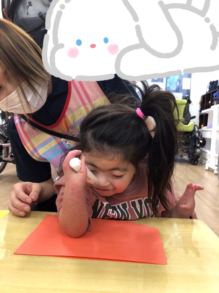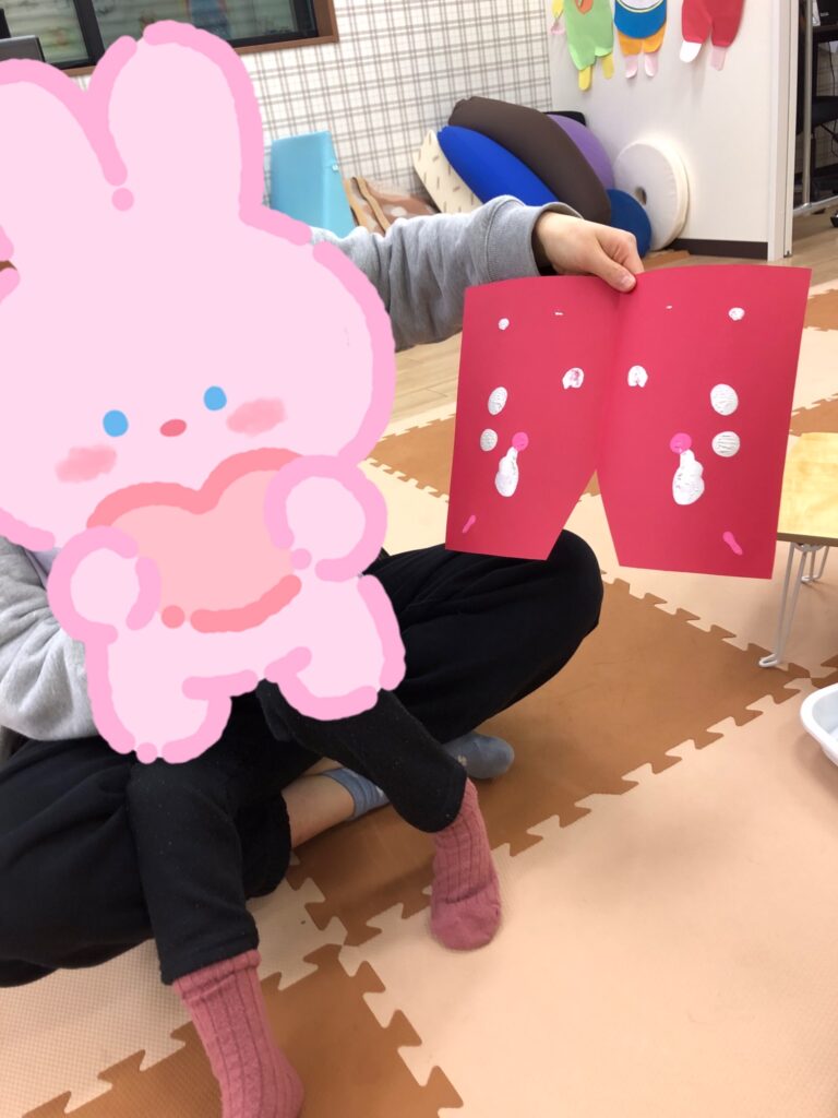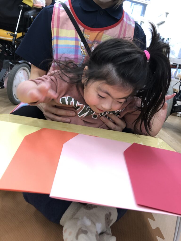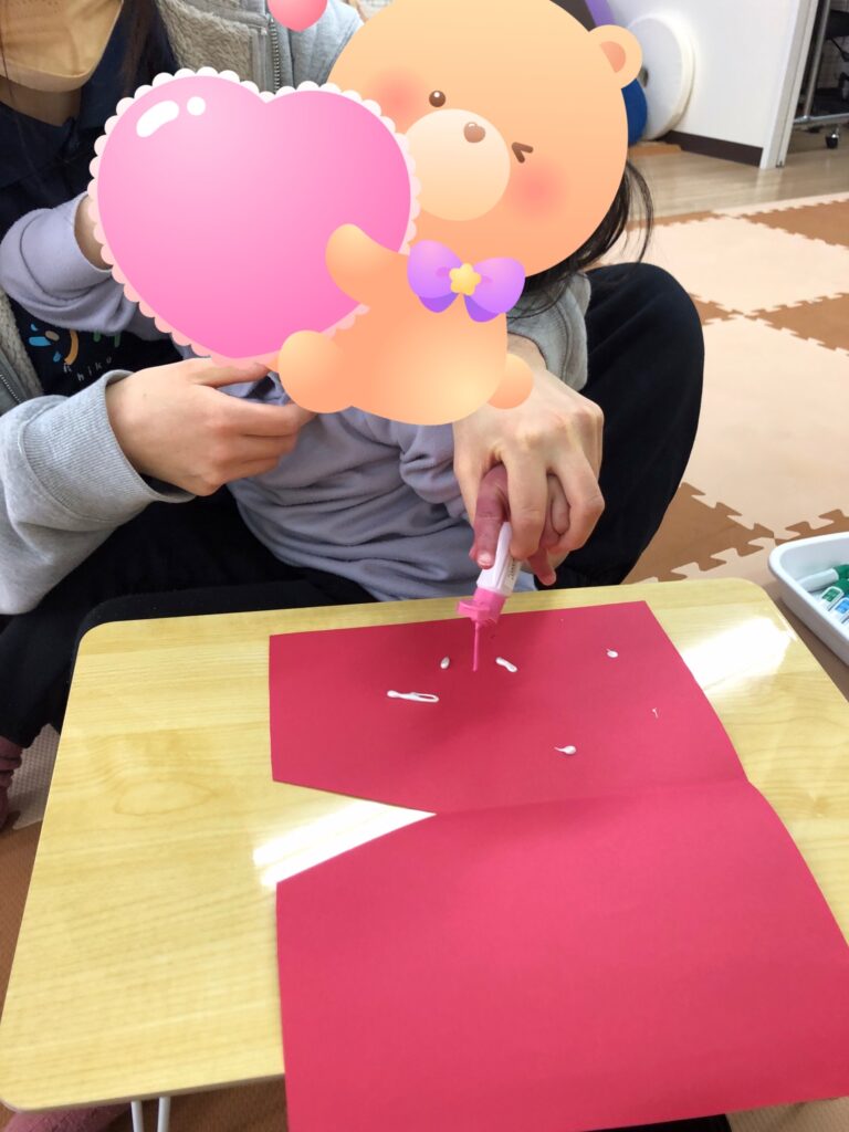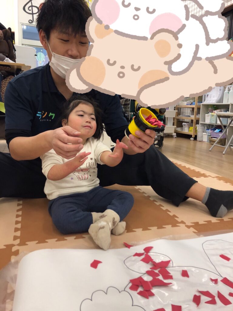 びよーん!と引っ張って、赤い画用紙を飛ばして赤鬼をつくっていきました(≧▽≦)