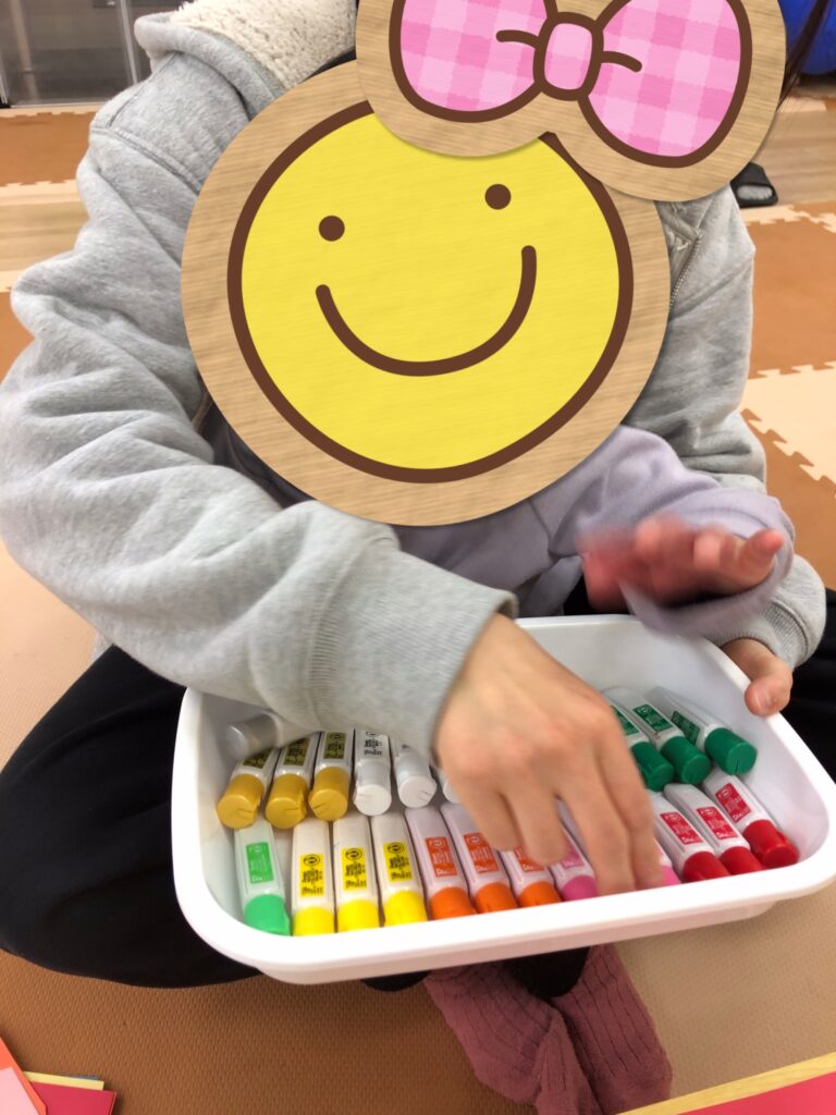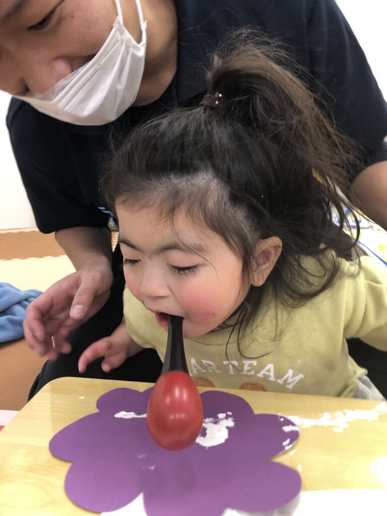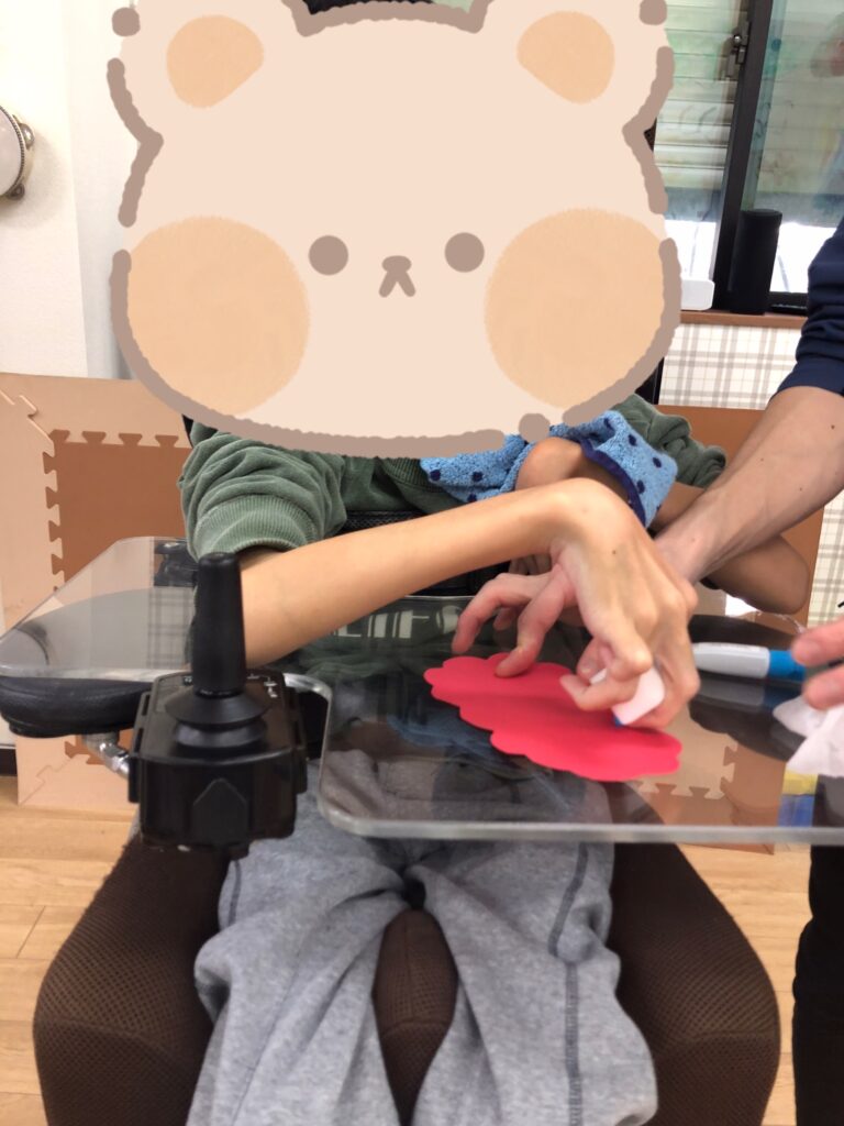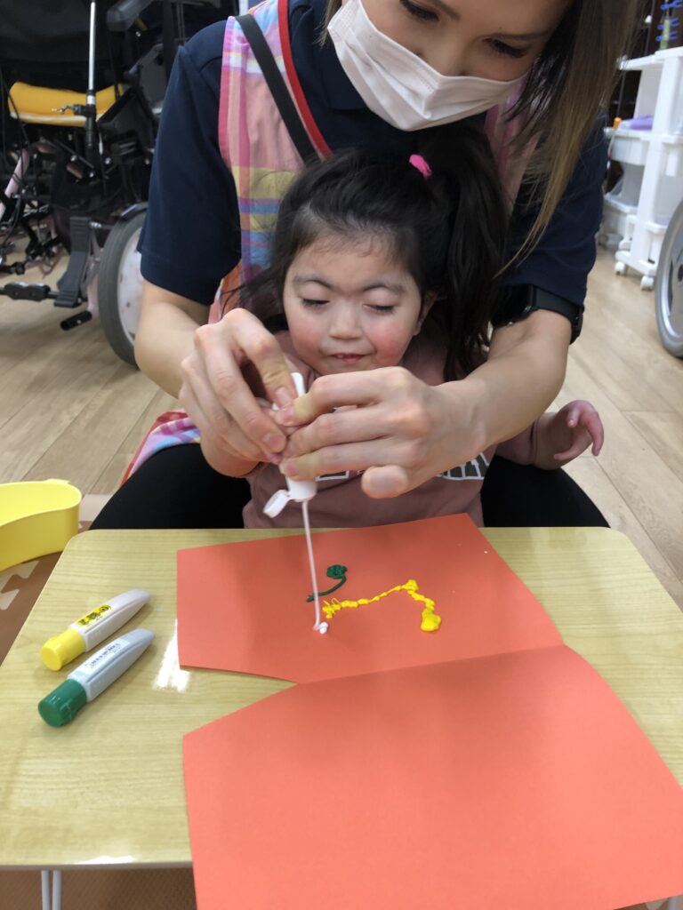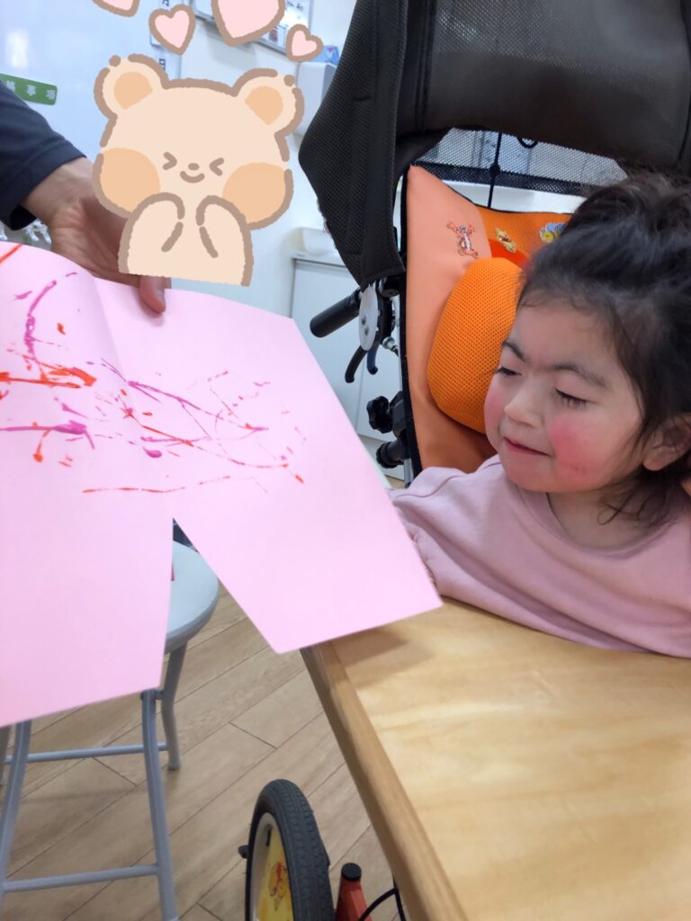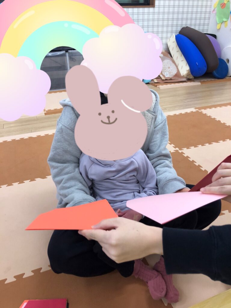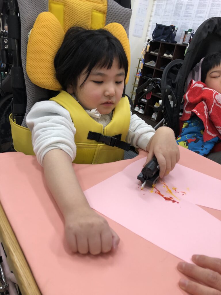びよーん!と引っ張って、赤い画用紙を飛ばして赤鬼をつくっていきました(≧▽≦)