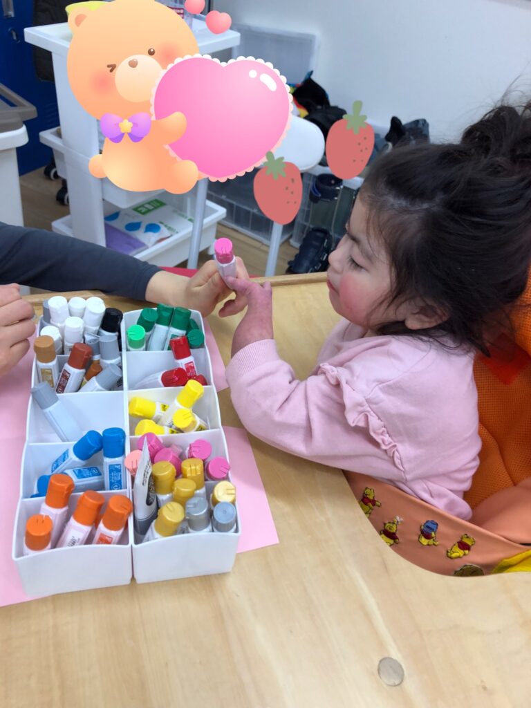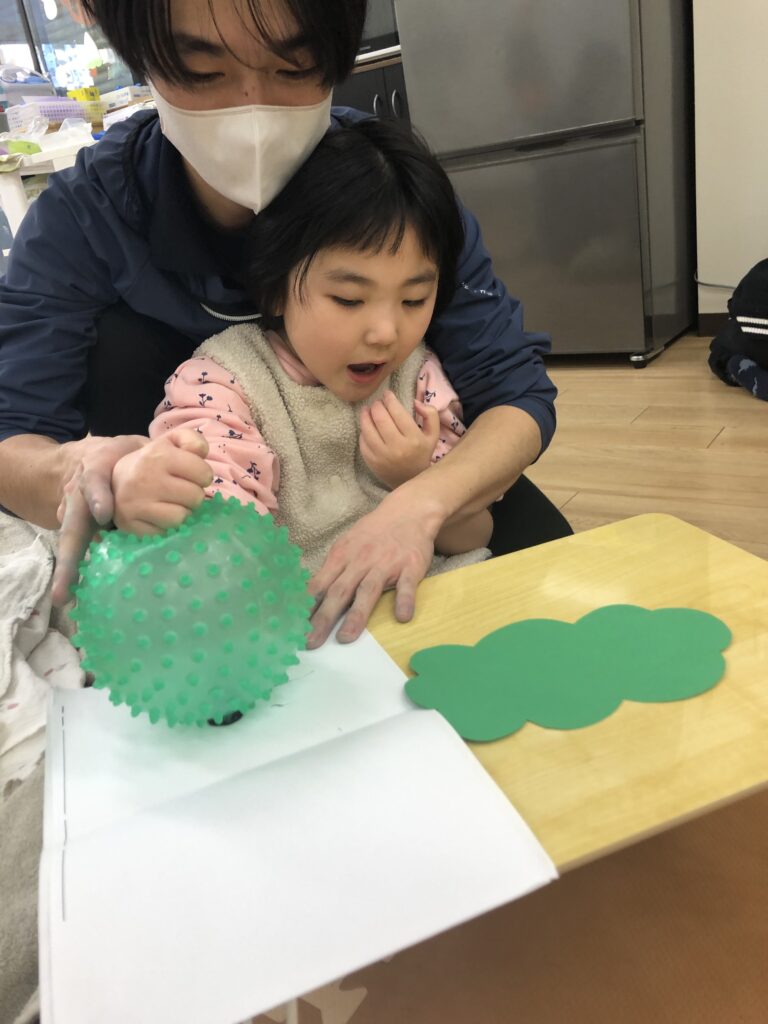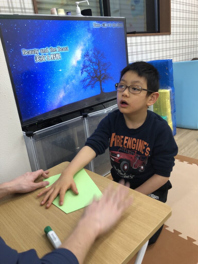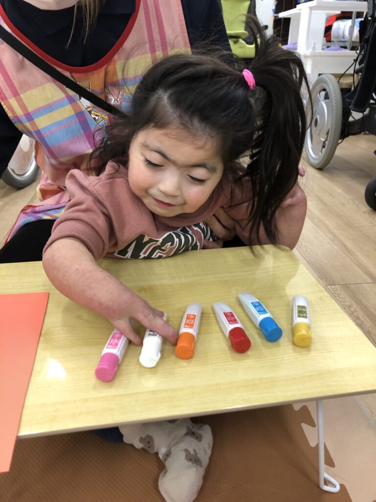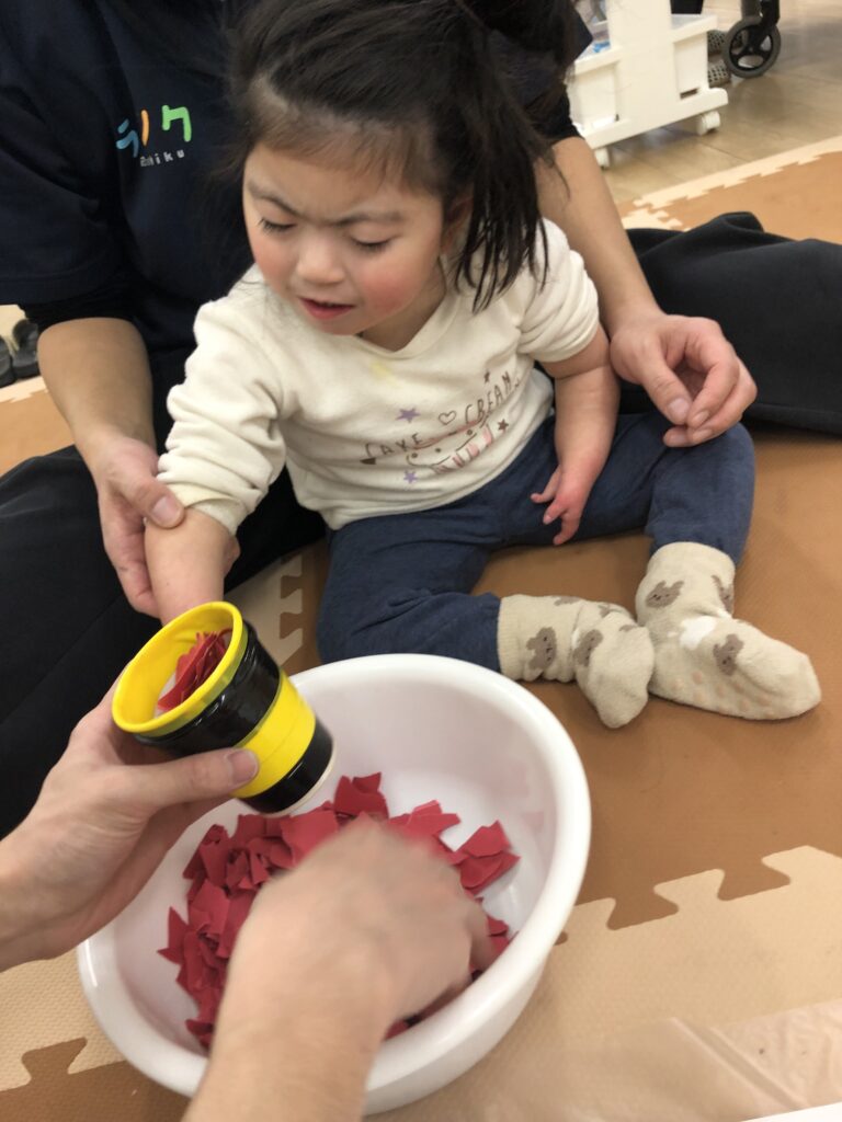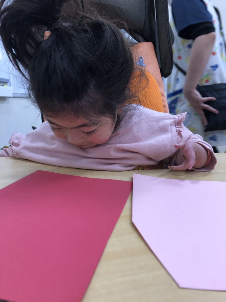 びよーん!と引っ張って、赤い画用紙を飛ばして赤鬼をつくっていきました(≧▽≦)