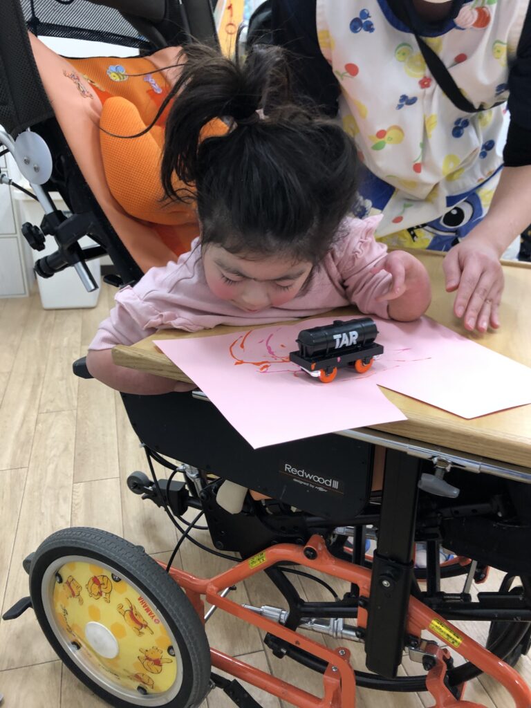 プラレールの車輪に絵の具を付けて、走らせて模様を描いていきました(´っ・ω・)っ