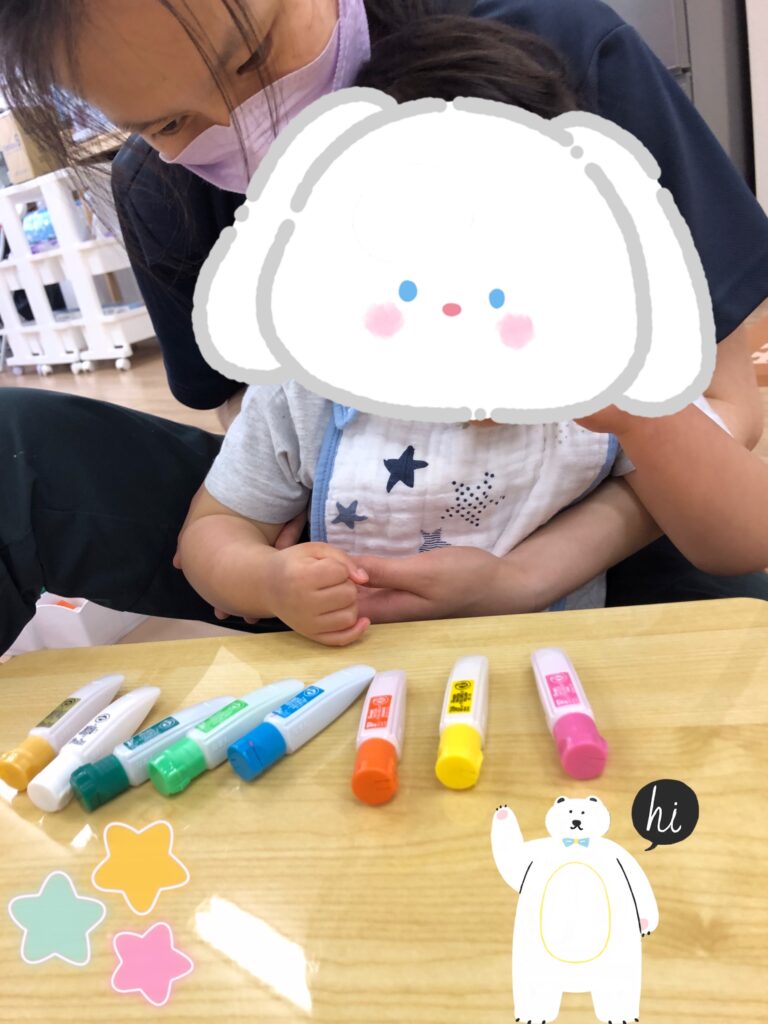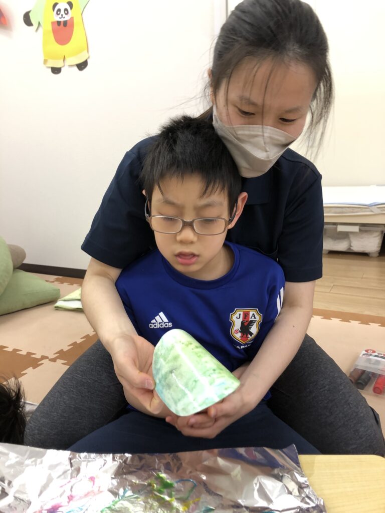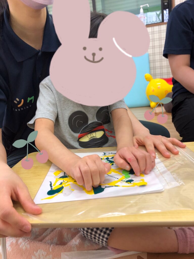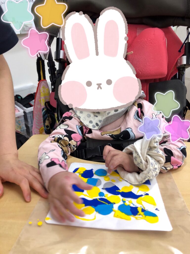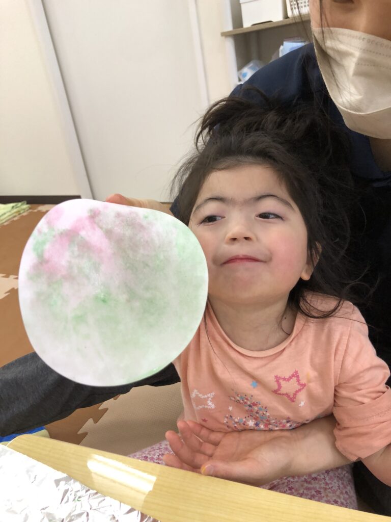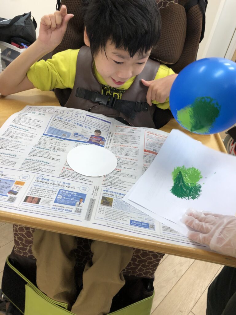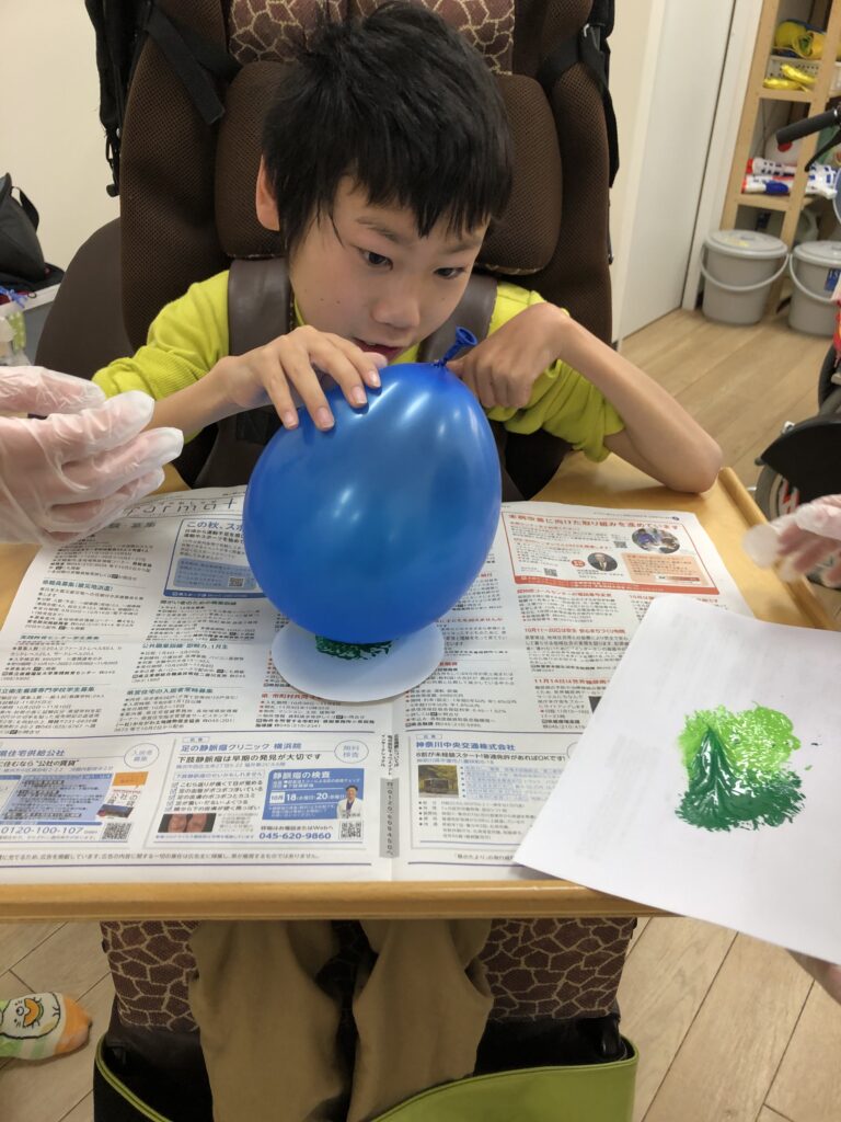 膨らませた風船に絵の具を付け、画用紙にぺたぺた…👐