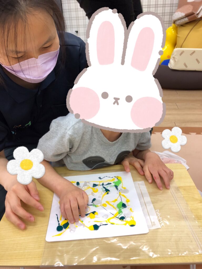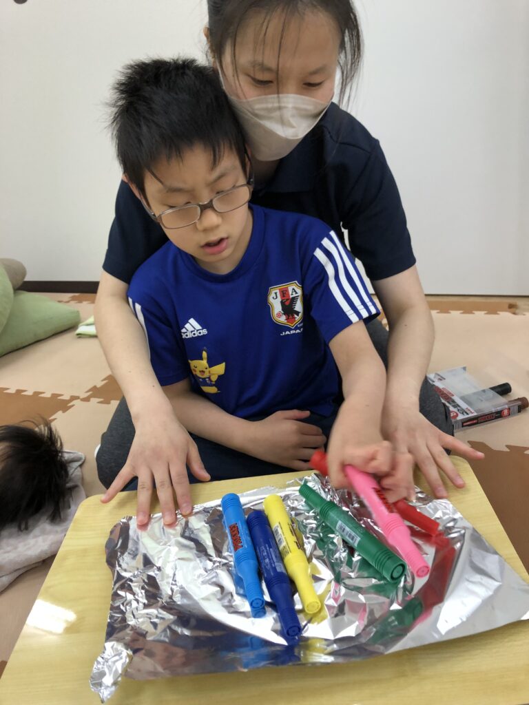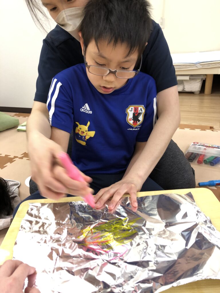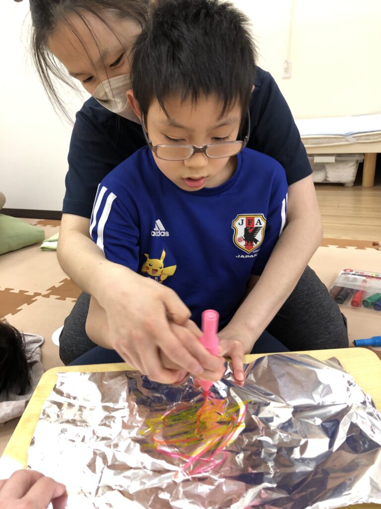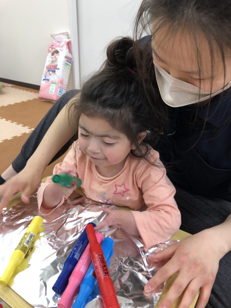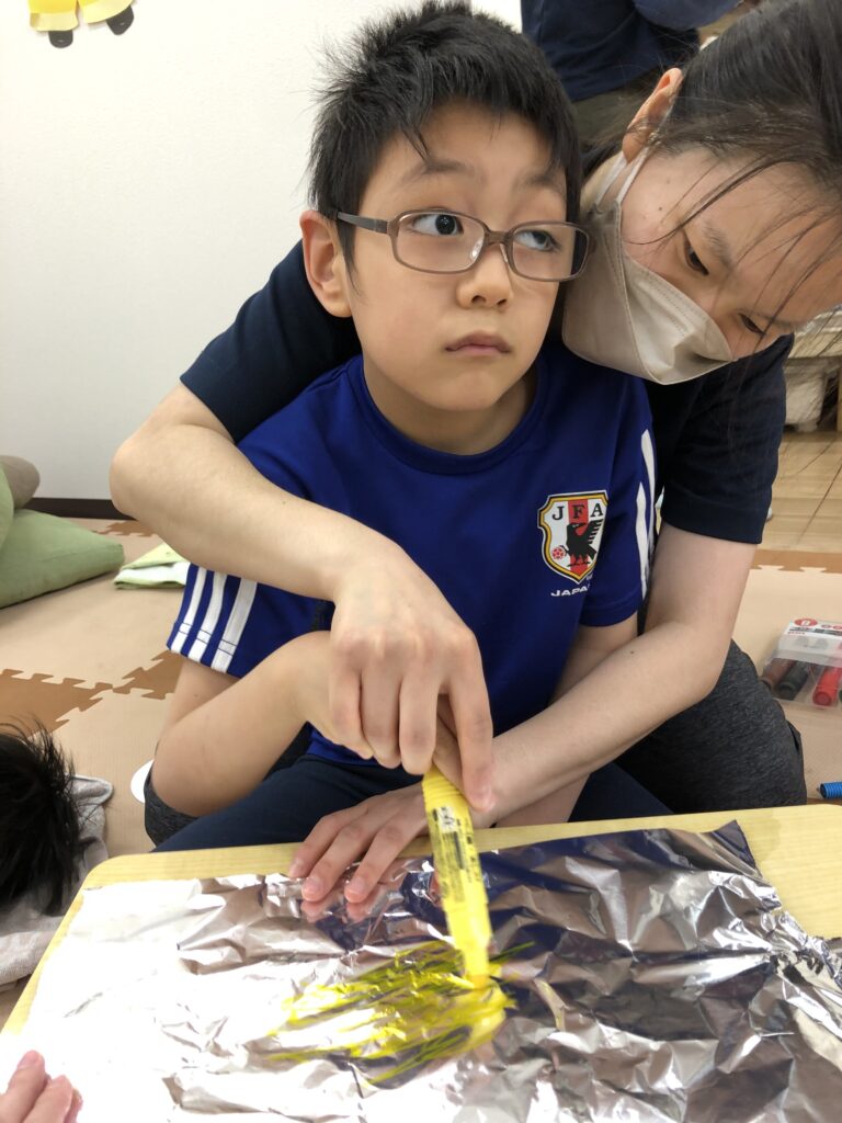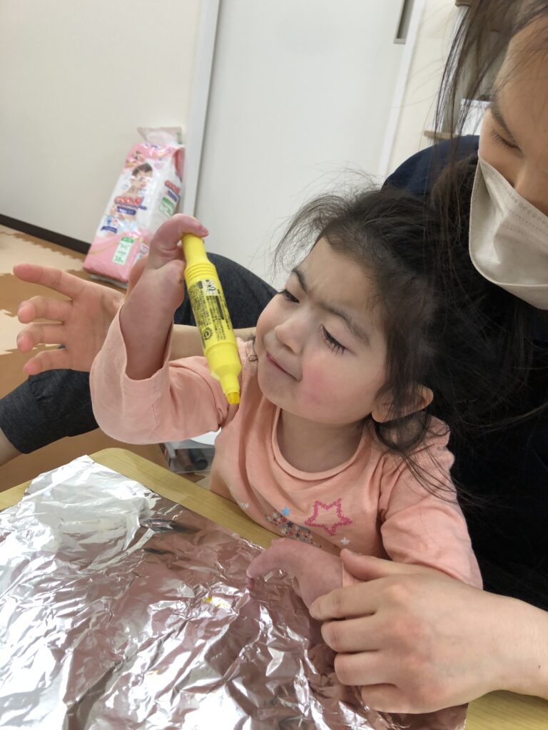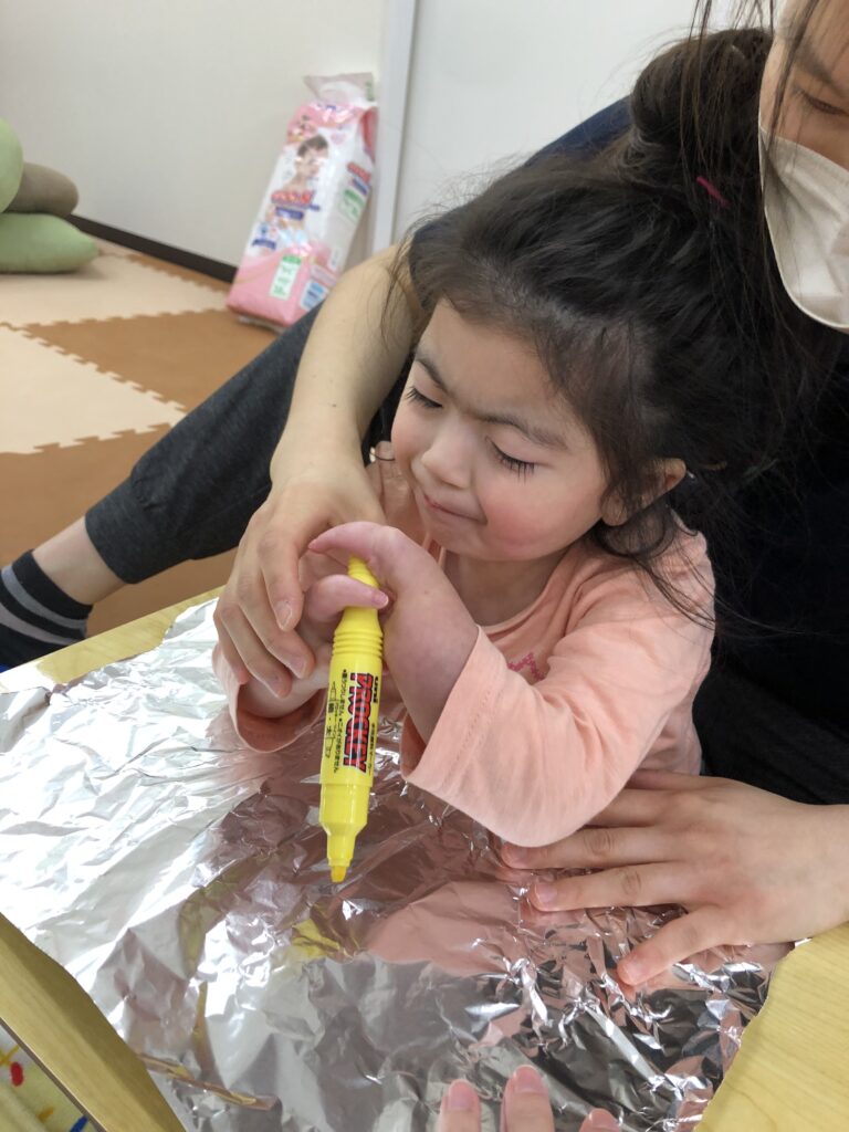 膨らませた風船に絵の具を付け、画用紙にぺたぺた…👐