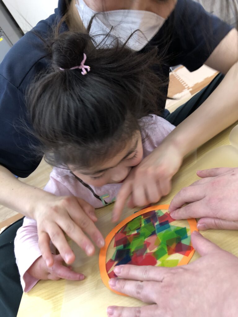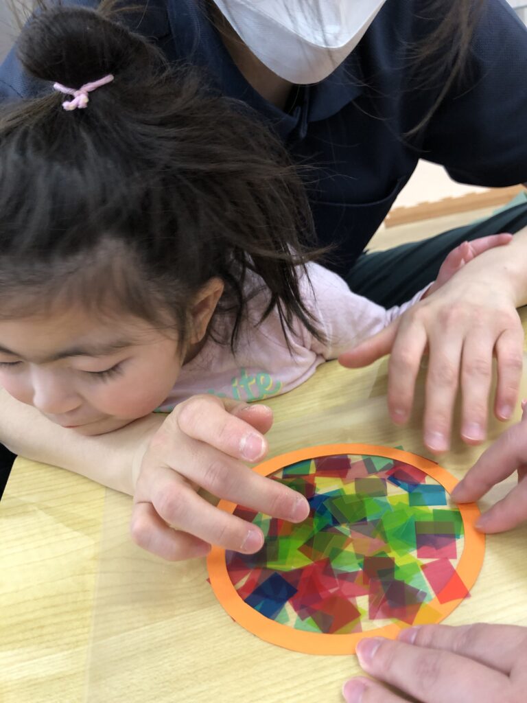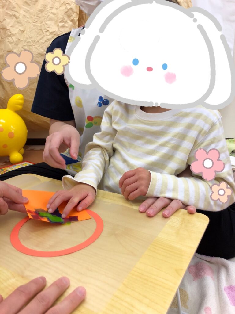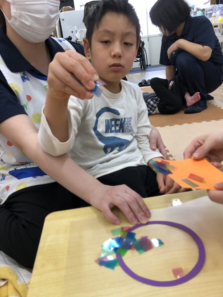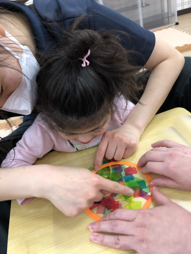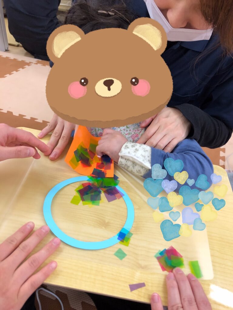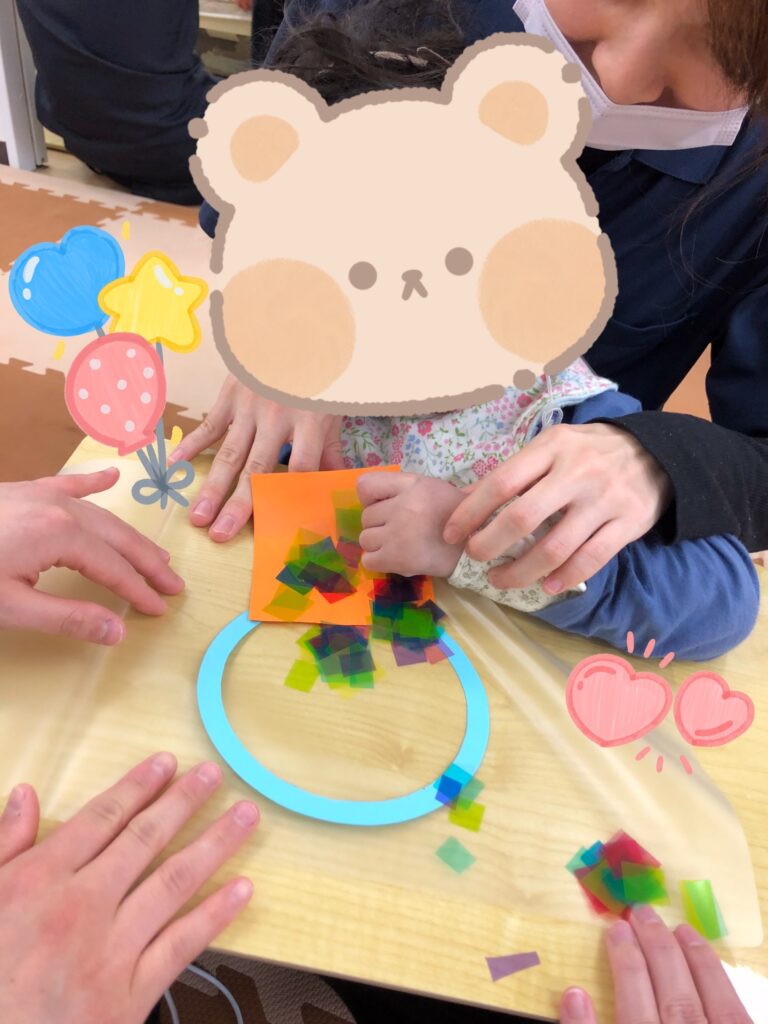 透明の折り紙を適当な大きさに切り、輪に切った画用紙の中に置いていきます(*^▽^*)✨