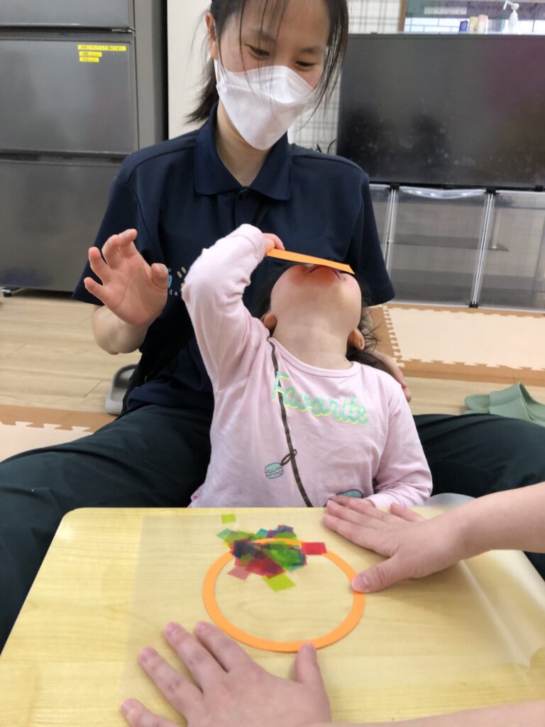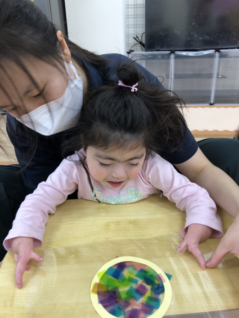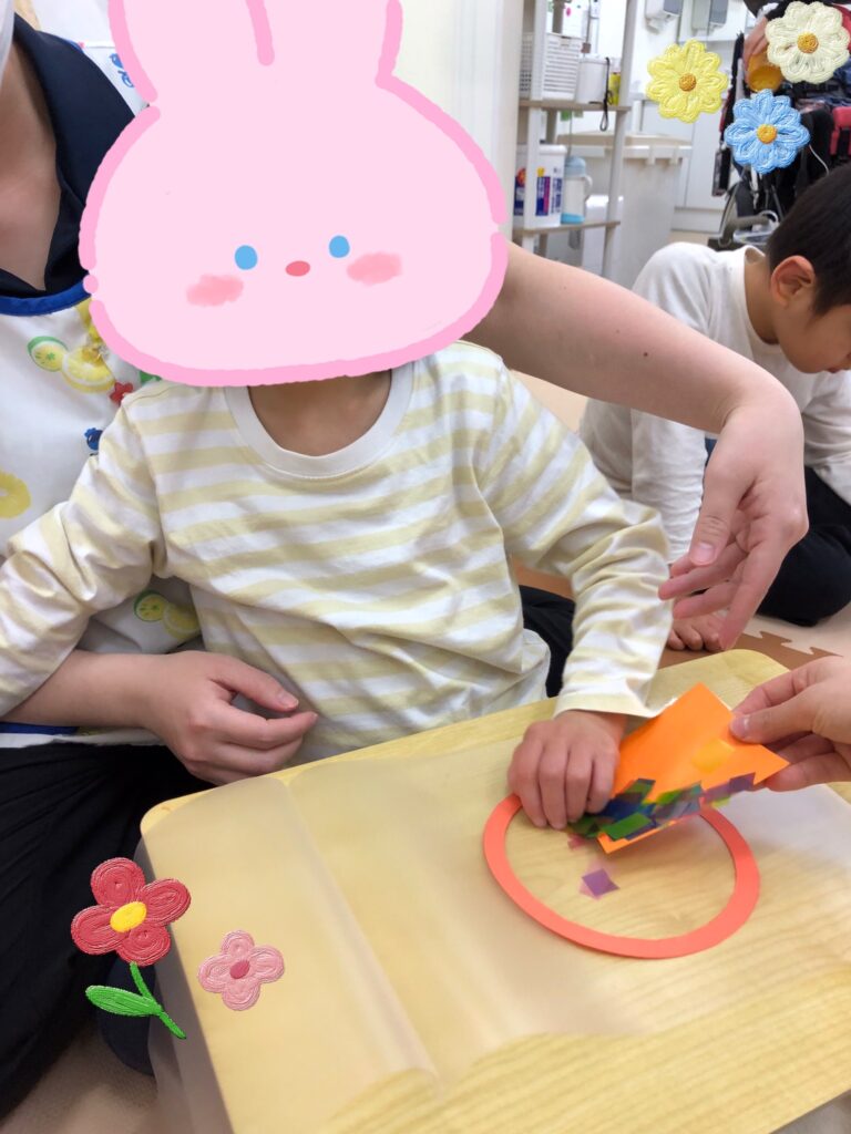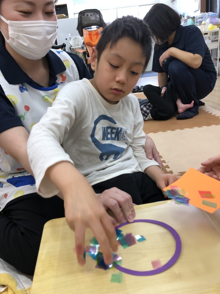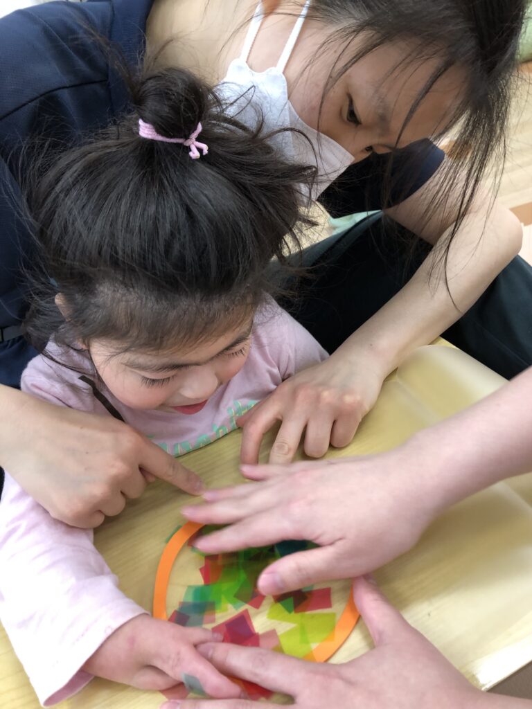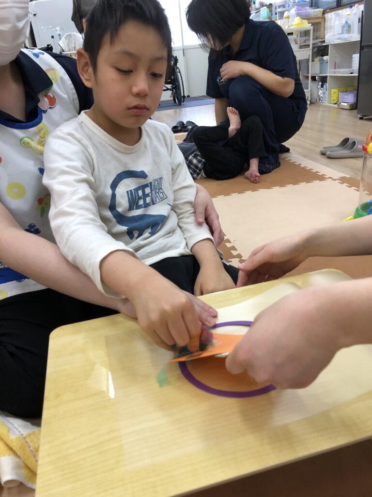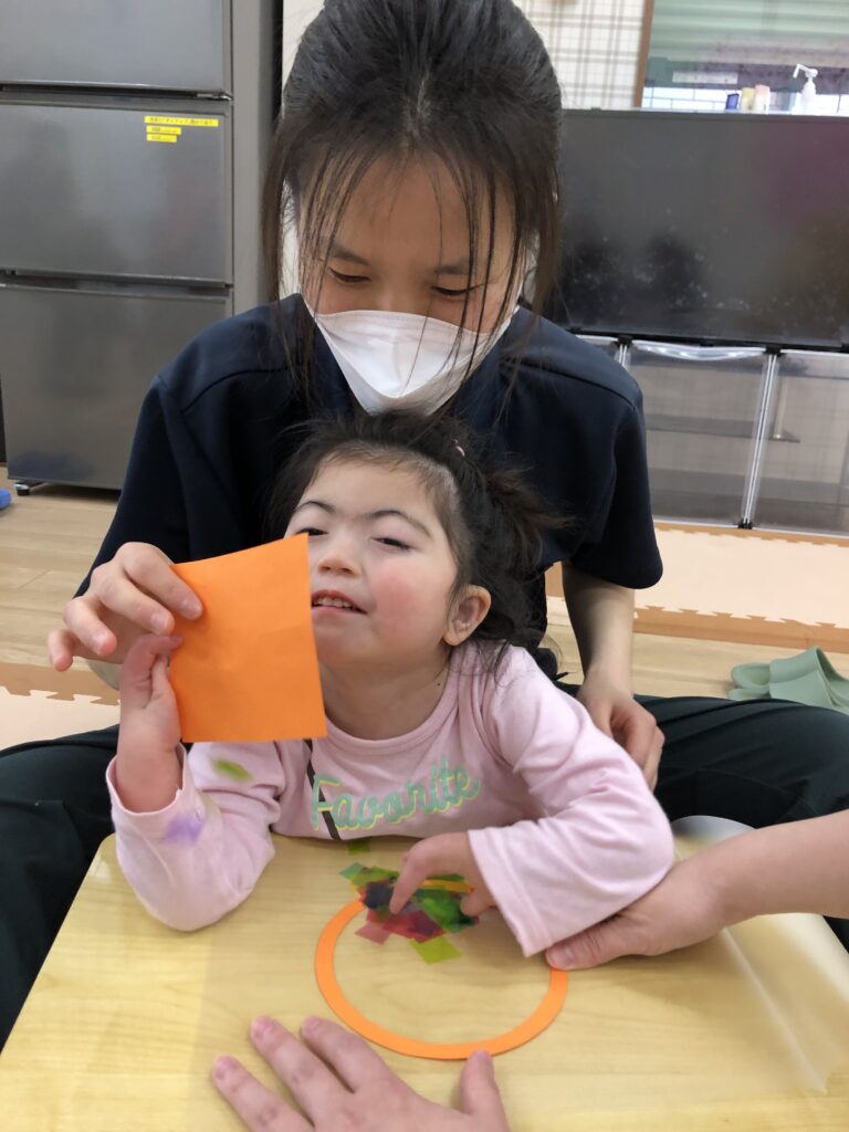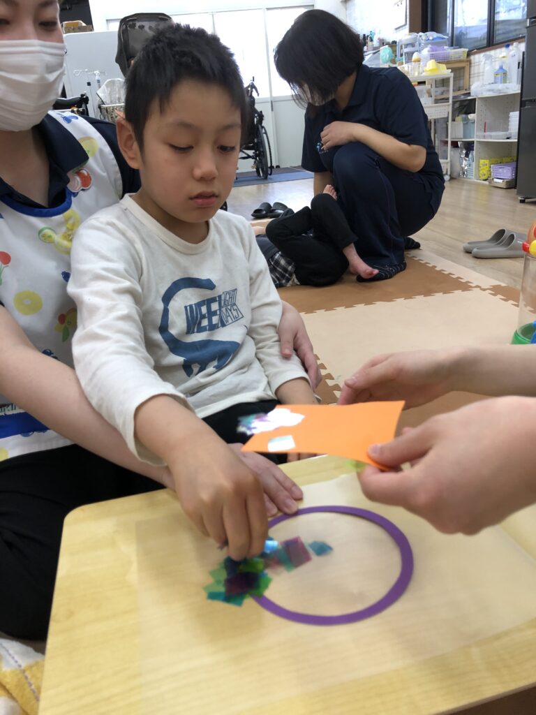 透明の折り紙を適当な大きさに切り、輪に切った画用紙の中に置いていきます(*^▽^*)✨