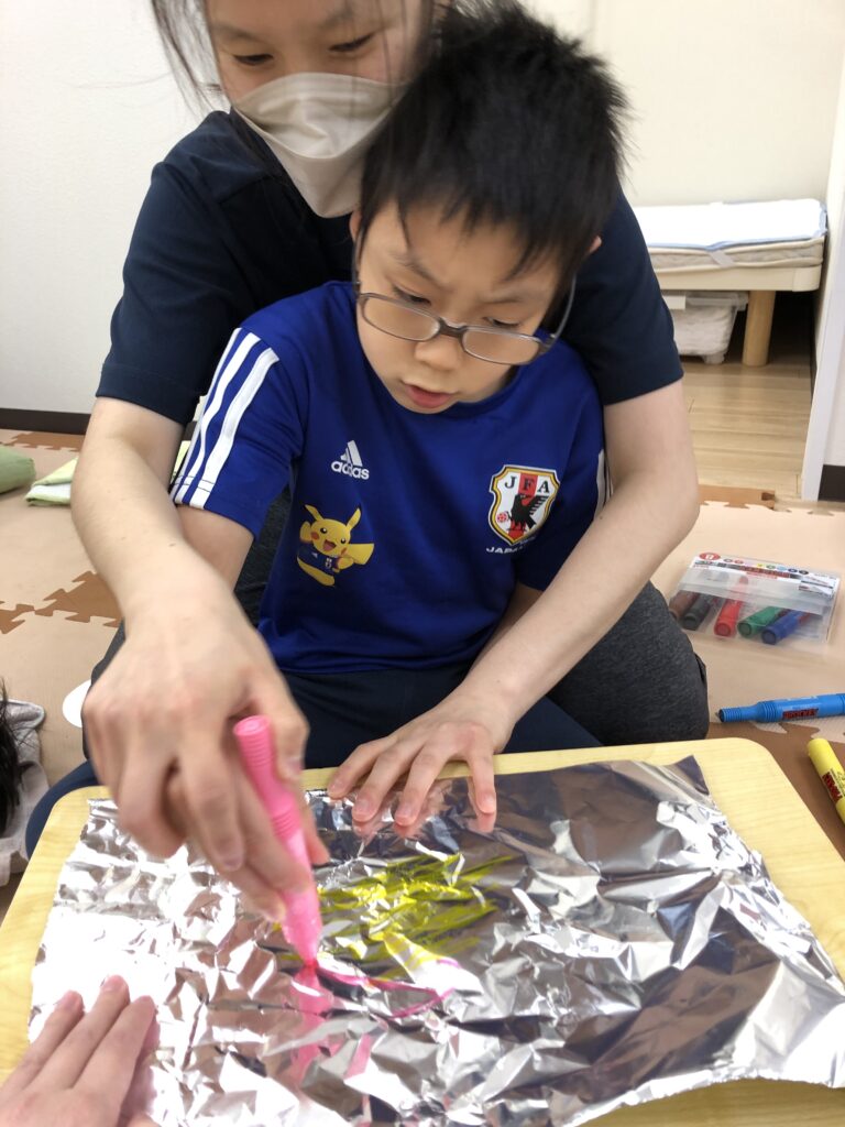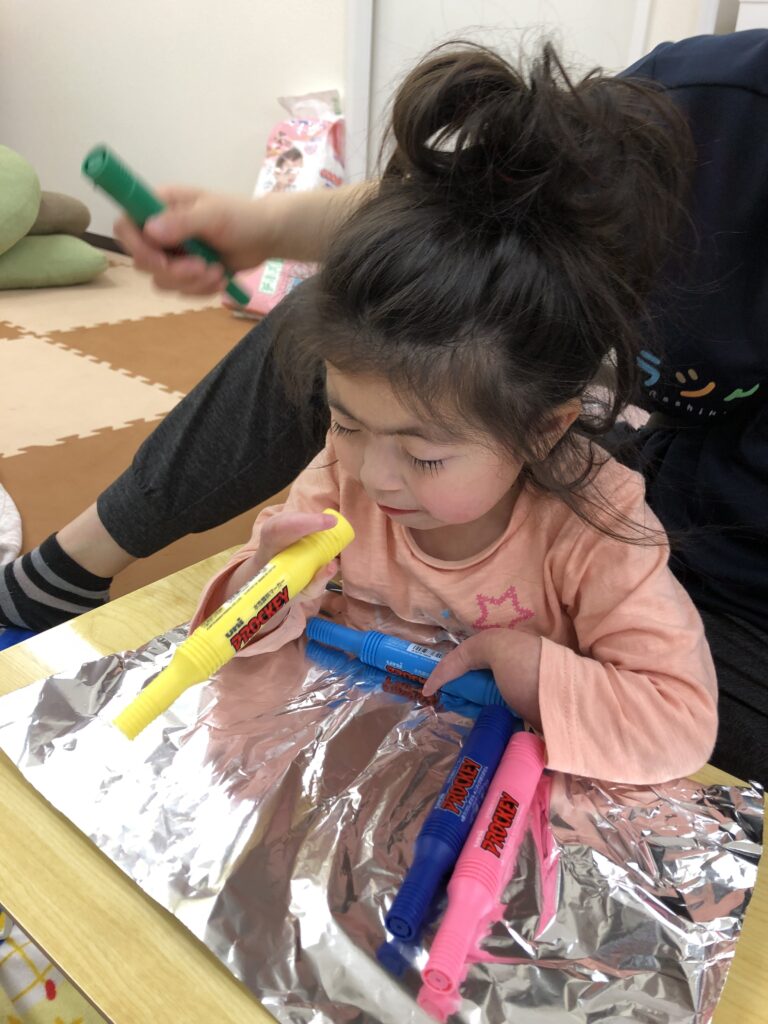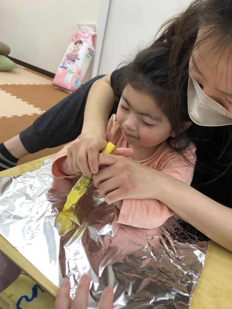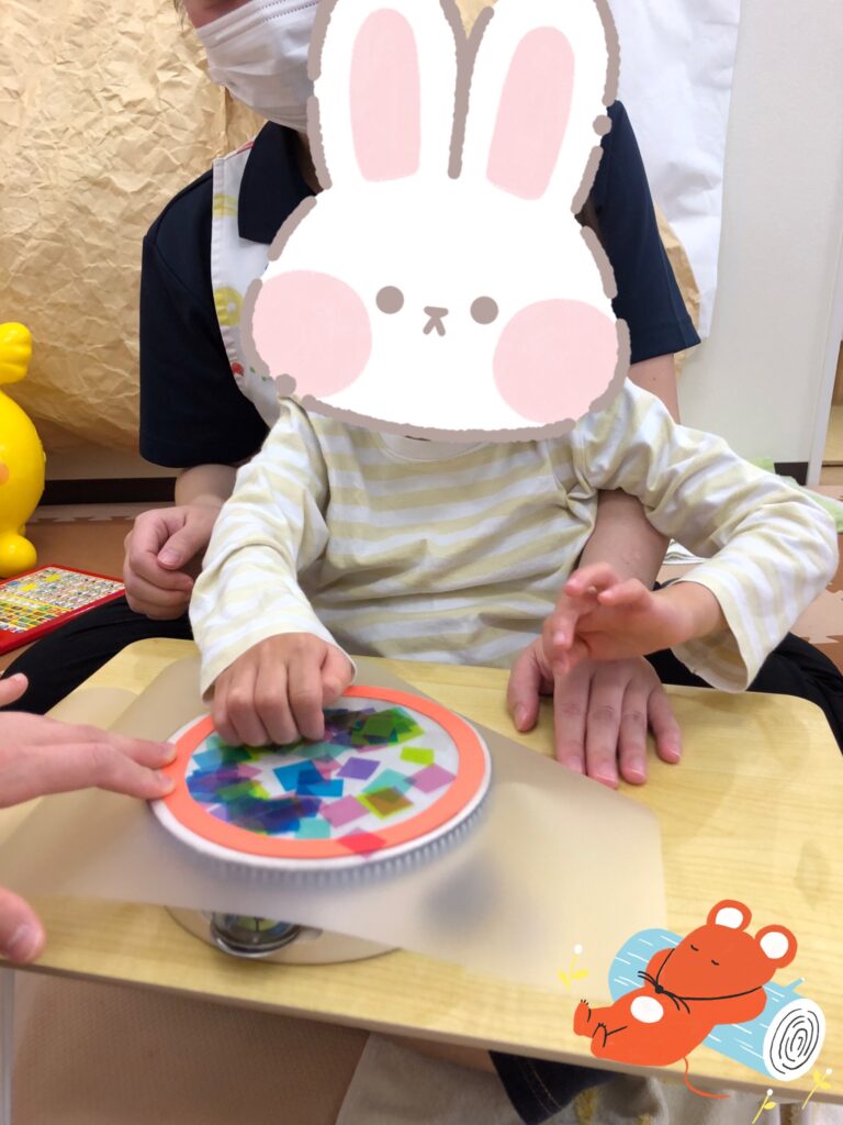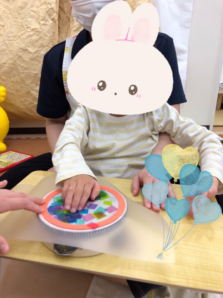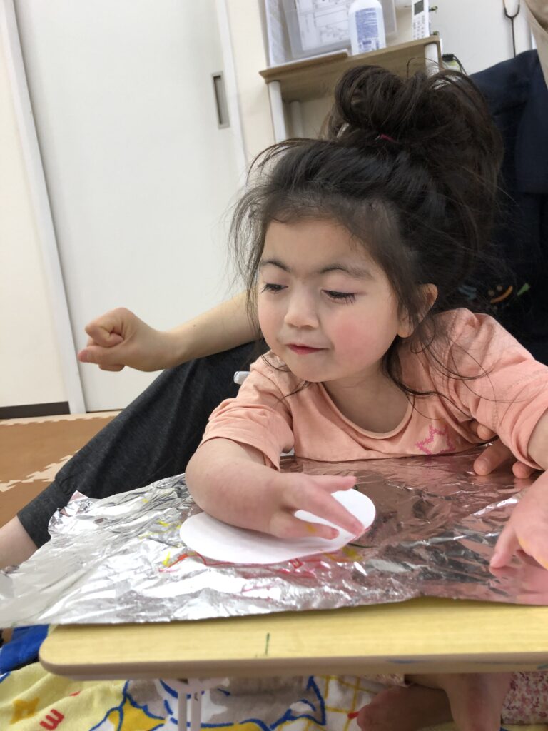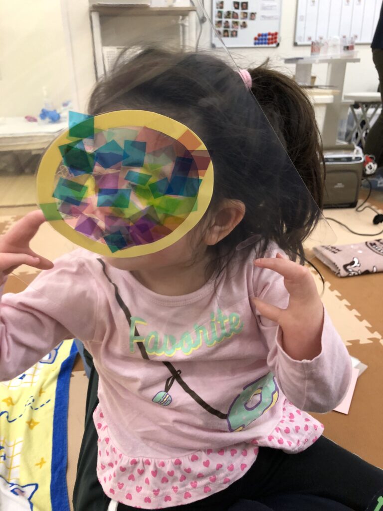 透明の折り紙を適当な大きさに切り、輪に切った画用紙の中に置いていきます(*^▽^*)✨