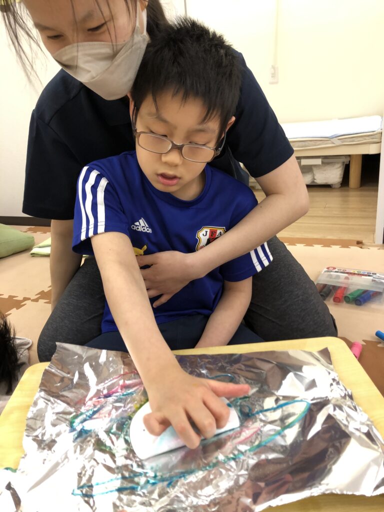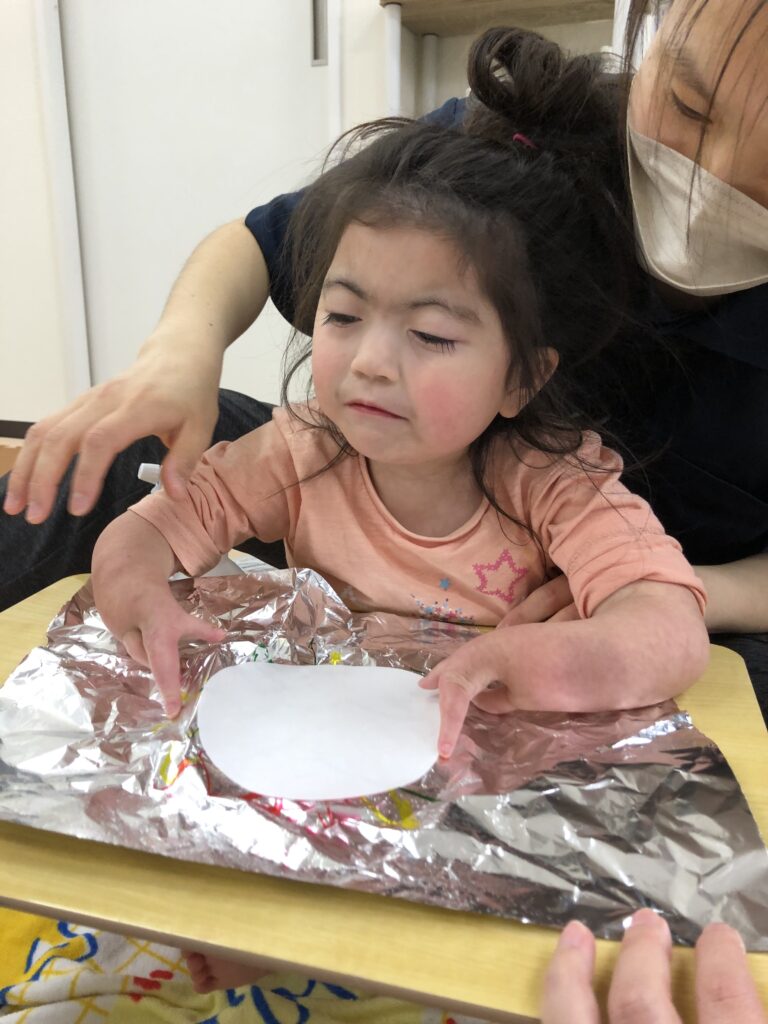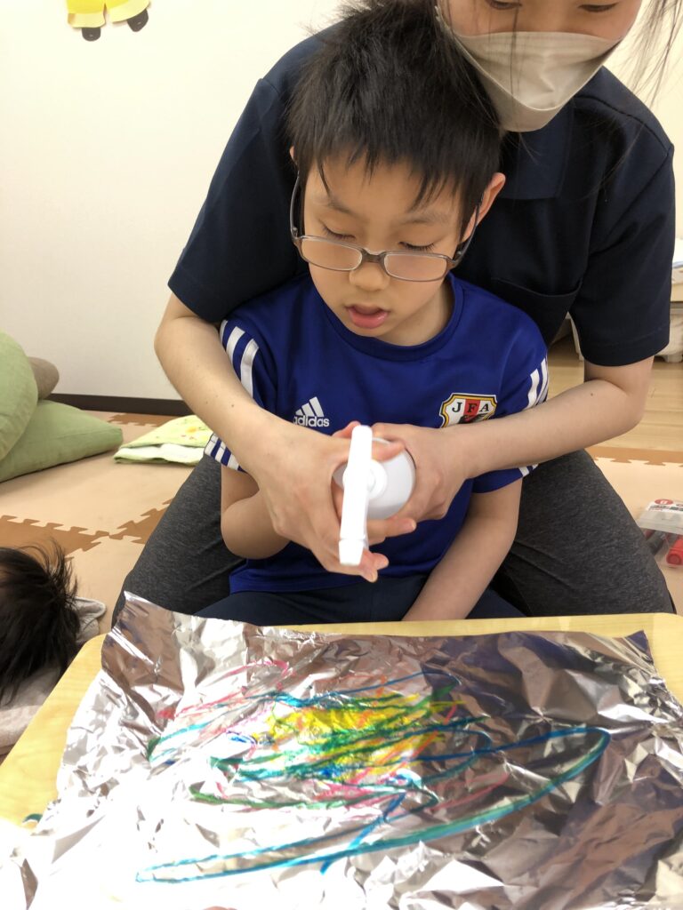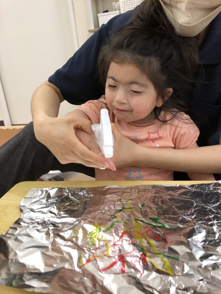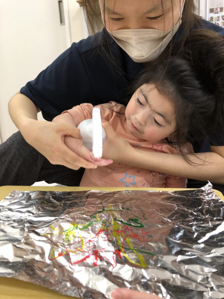 描いたところに水を吹きかけ、画用紙を置くと…🎶