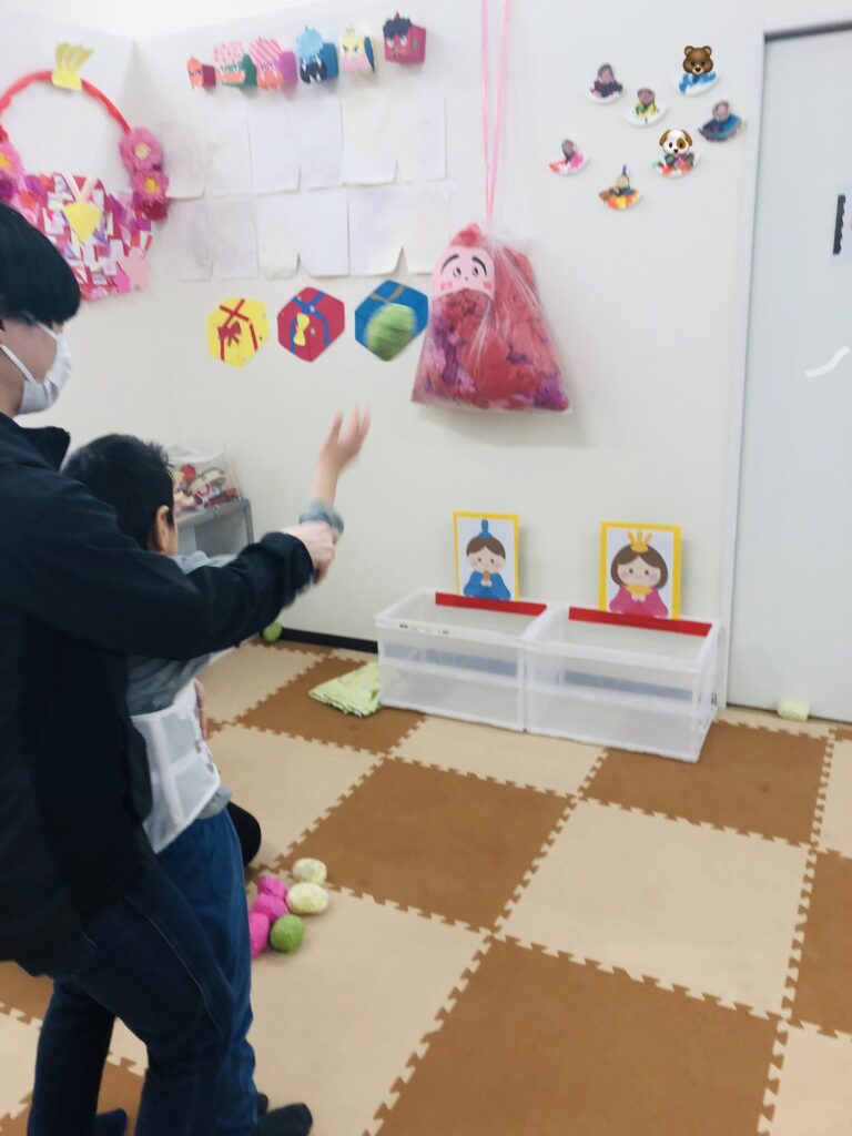 ひなあられに見立てた新聞紙ボールをお内裏様とお雛様の箱に投げていきます!🥎