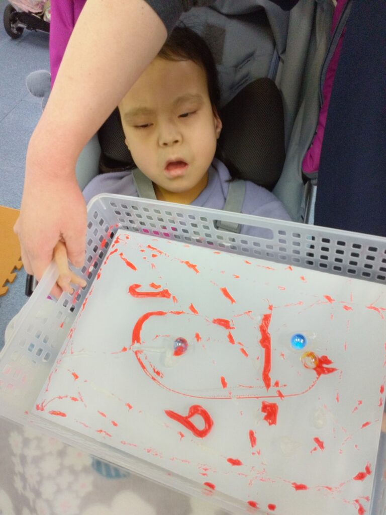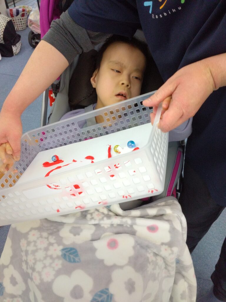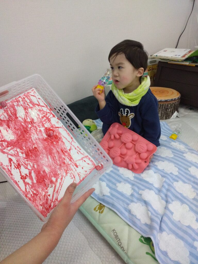 また、ビー玉の転がる所を目で追い、絵の具が広がっていく様子を不思議そうな表情で見ていたお友達や、笑顔を見せてくれたお友達・・・😊✨
