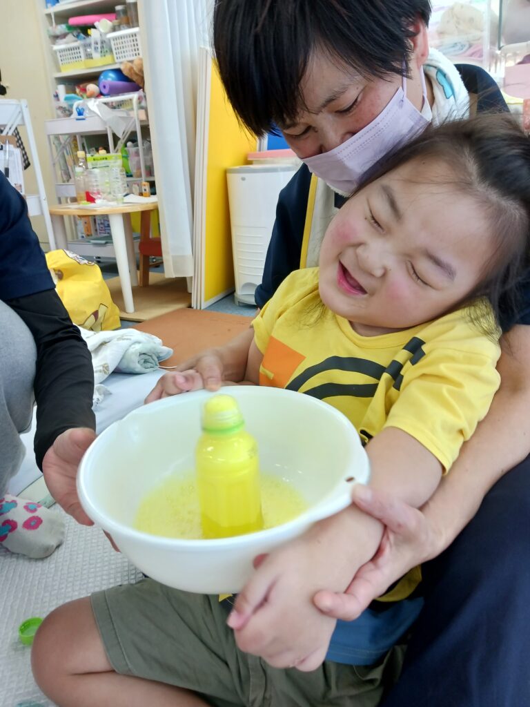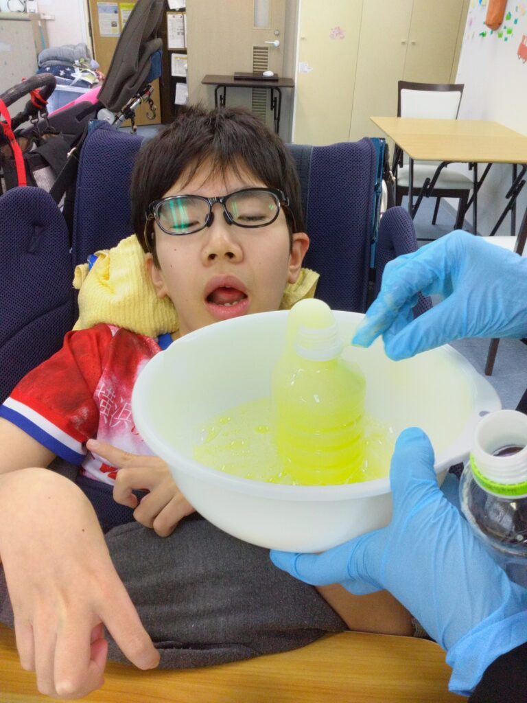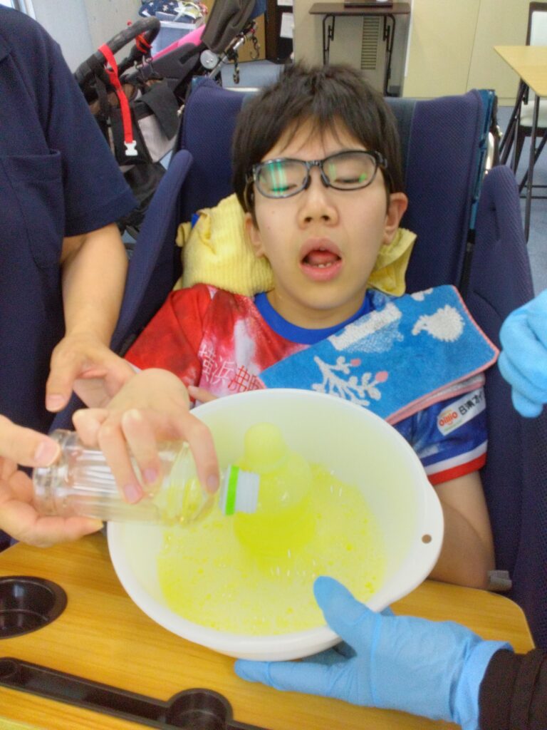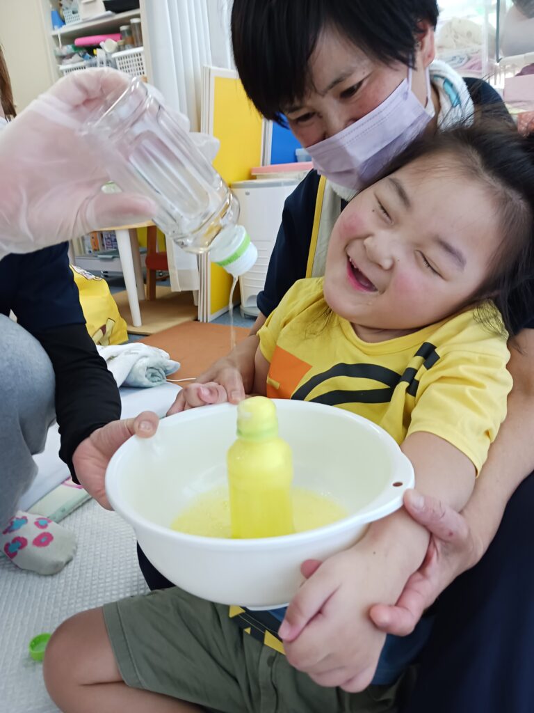 さすがお兄さん❗上手にお酢をいれて大きな黄色の噴水ができました👏🏻