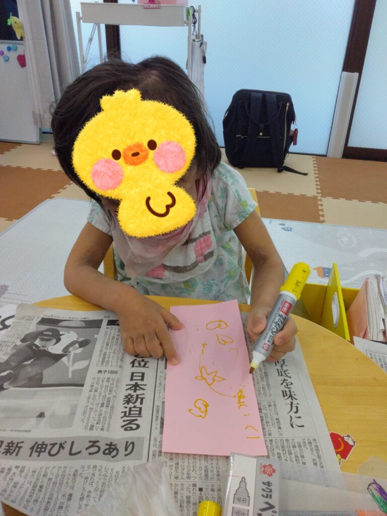 自分でペンを持って書くよ😎星の飾りをつけてかわいく💕したよ(*´ω`*)🌟