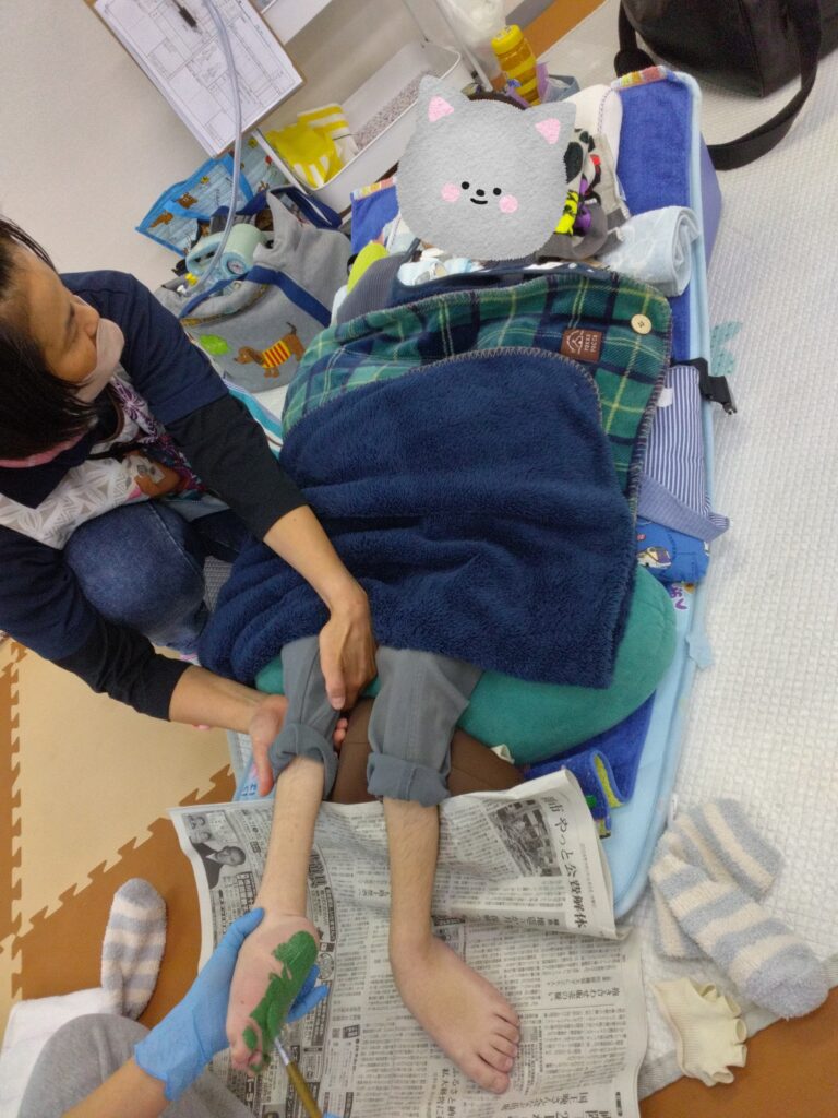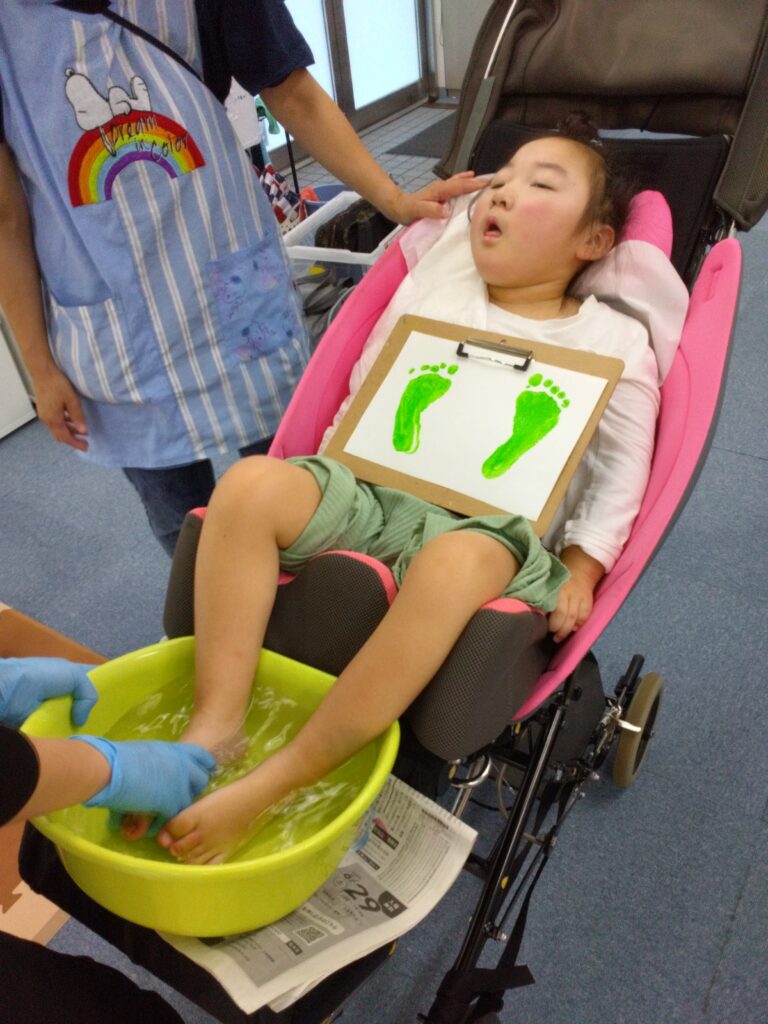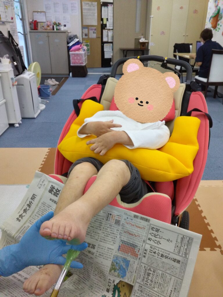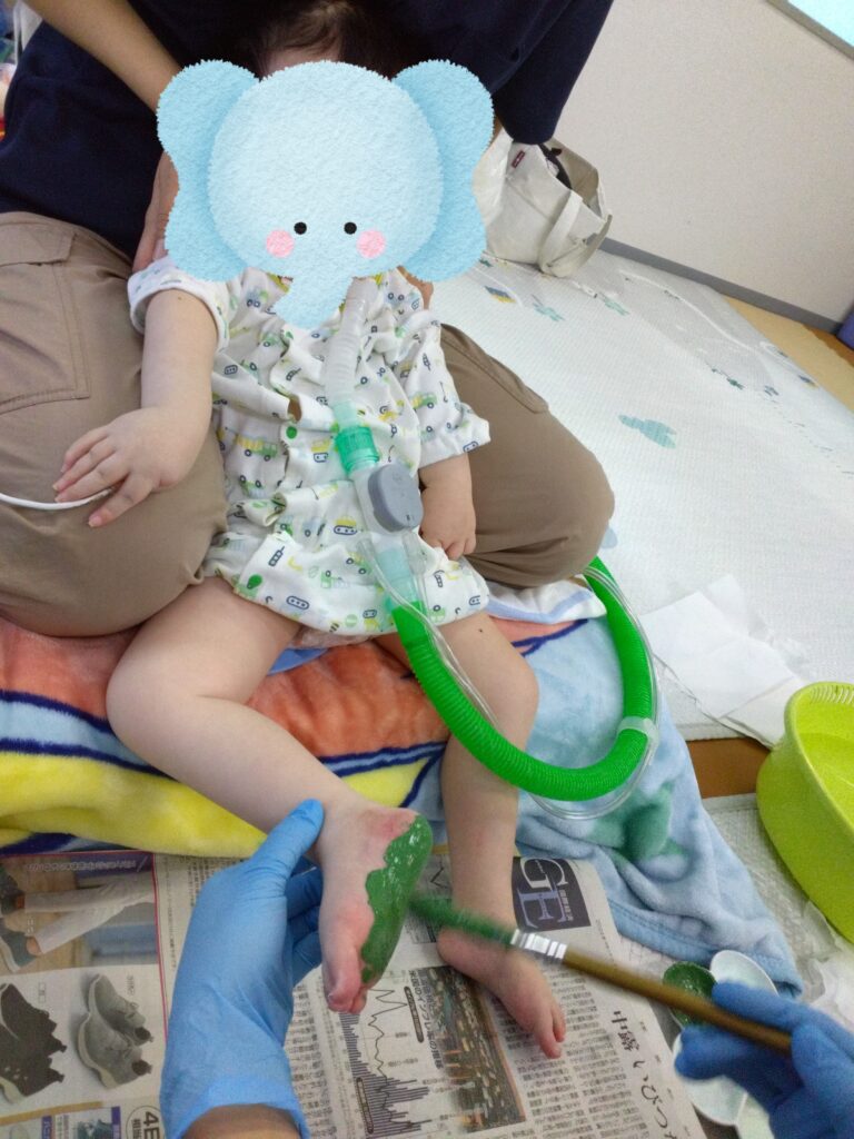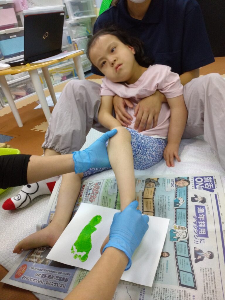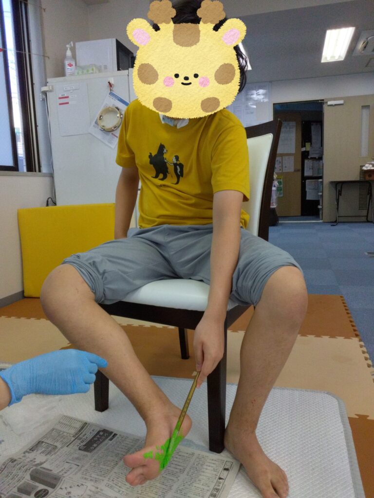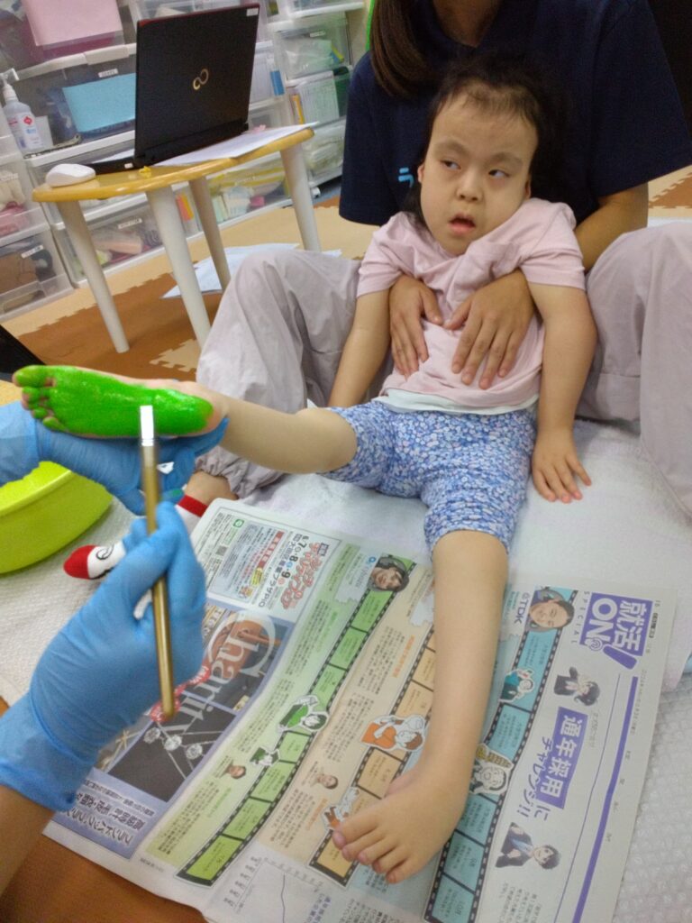 筆で足裏に絵の具を塗ると、「かゆかゆかゆ、、、」と言いながらくすぐったいのに耐える子や