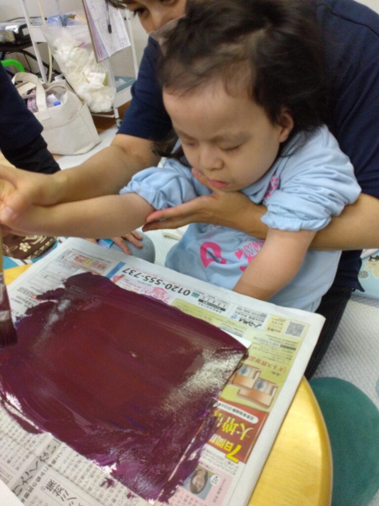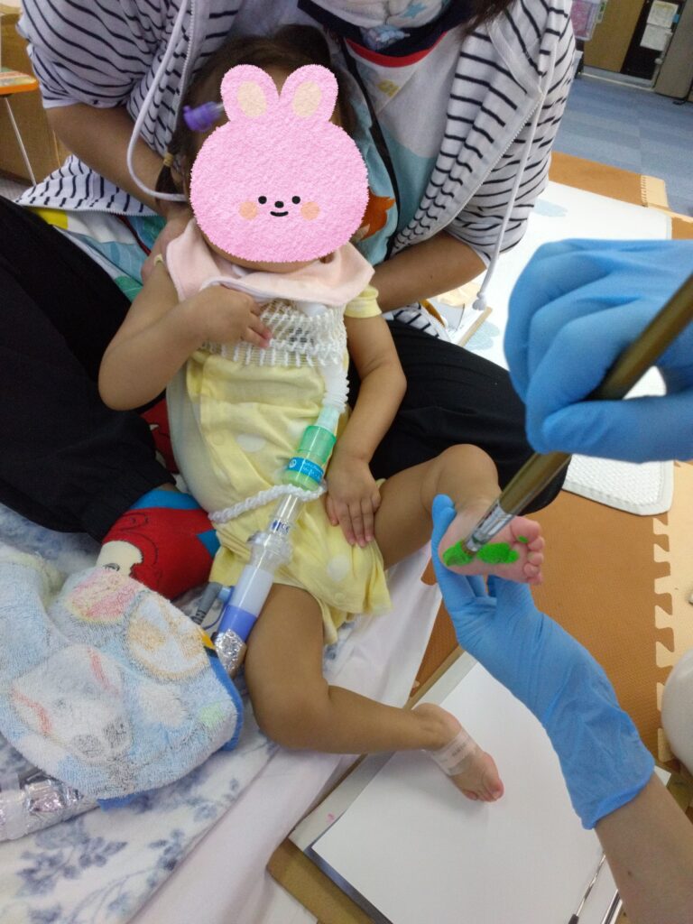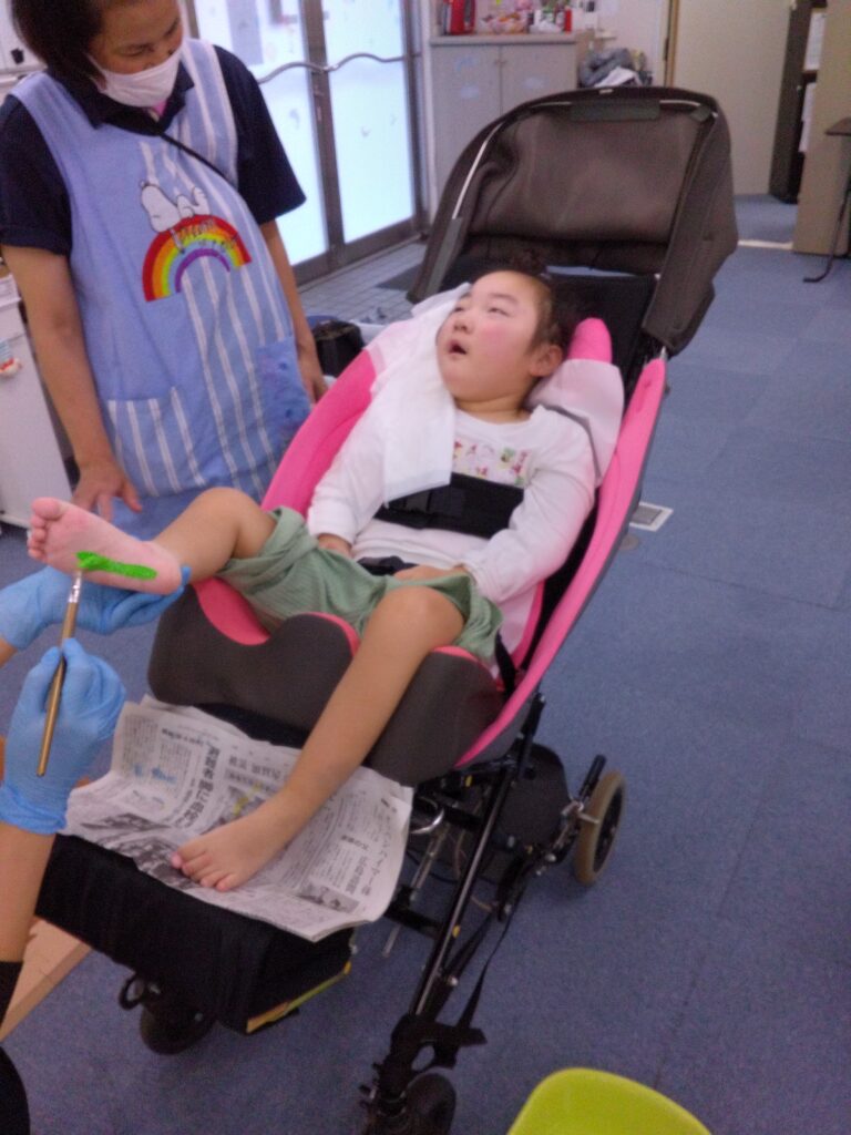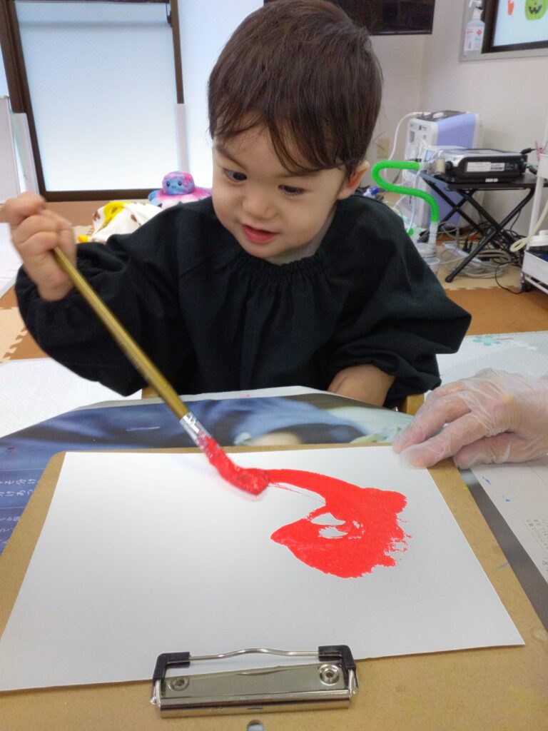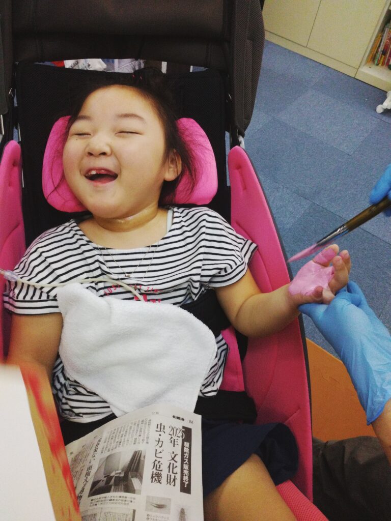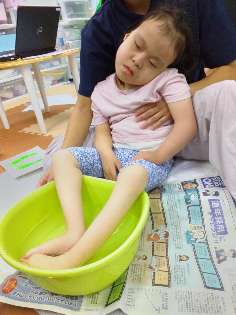 筆で足裏に絵の具を塗ると、「かゆかゆかゆ、、、」と言いながらくすぐったいのに耐える子や