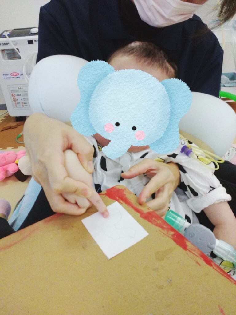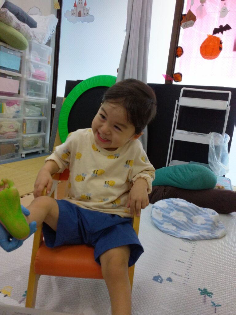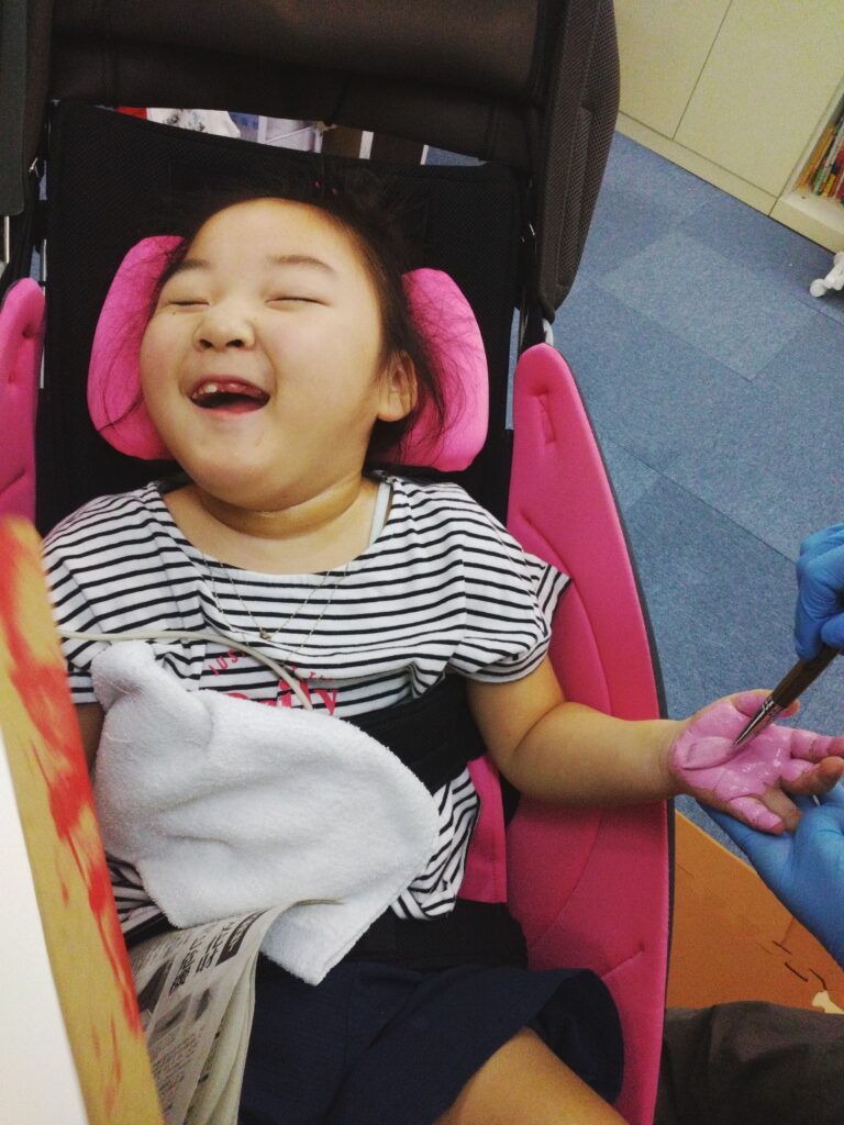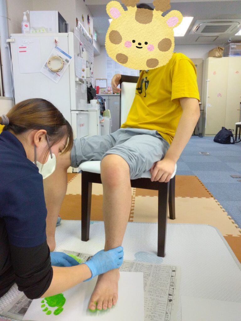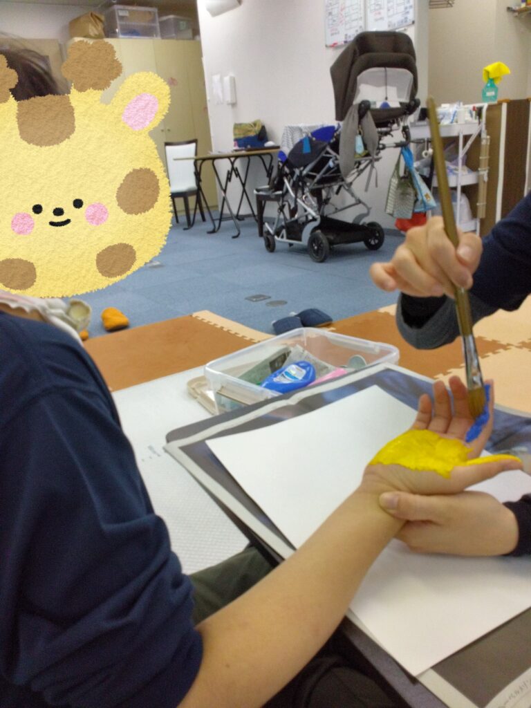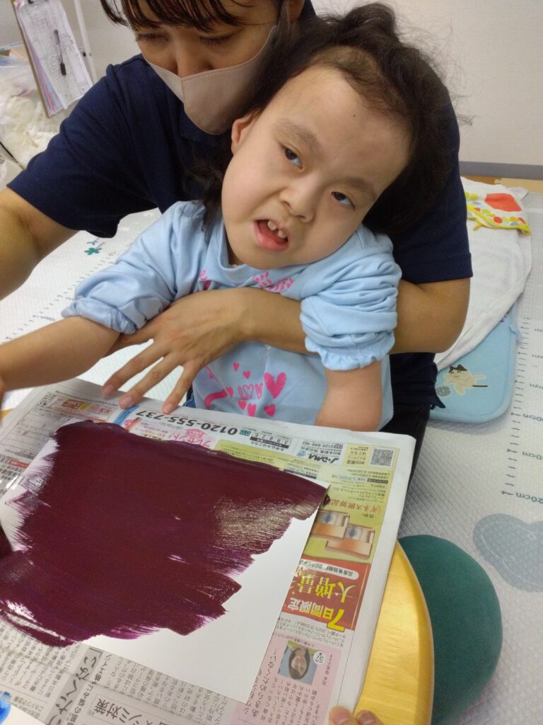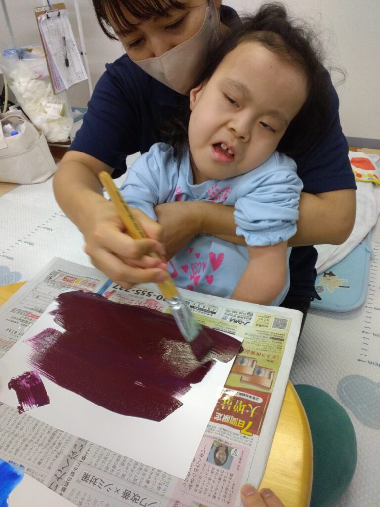 筆で足裏に絵の具を塗ると、「かゆかゆかゆ、、、」と言いながらくすぐったいのに耐える子や