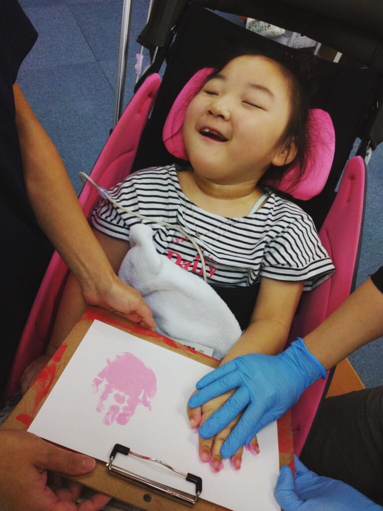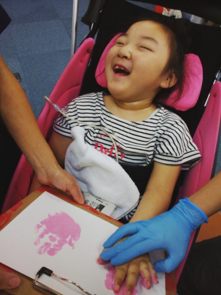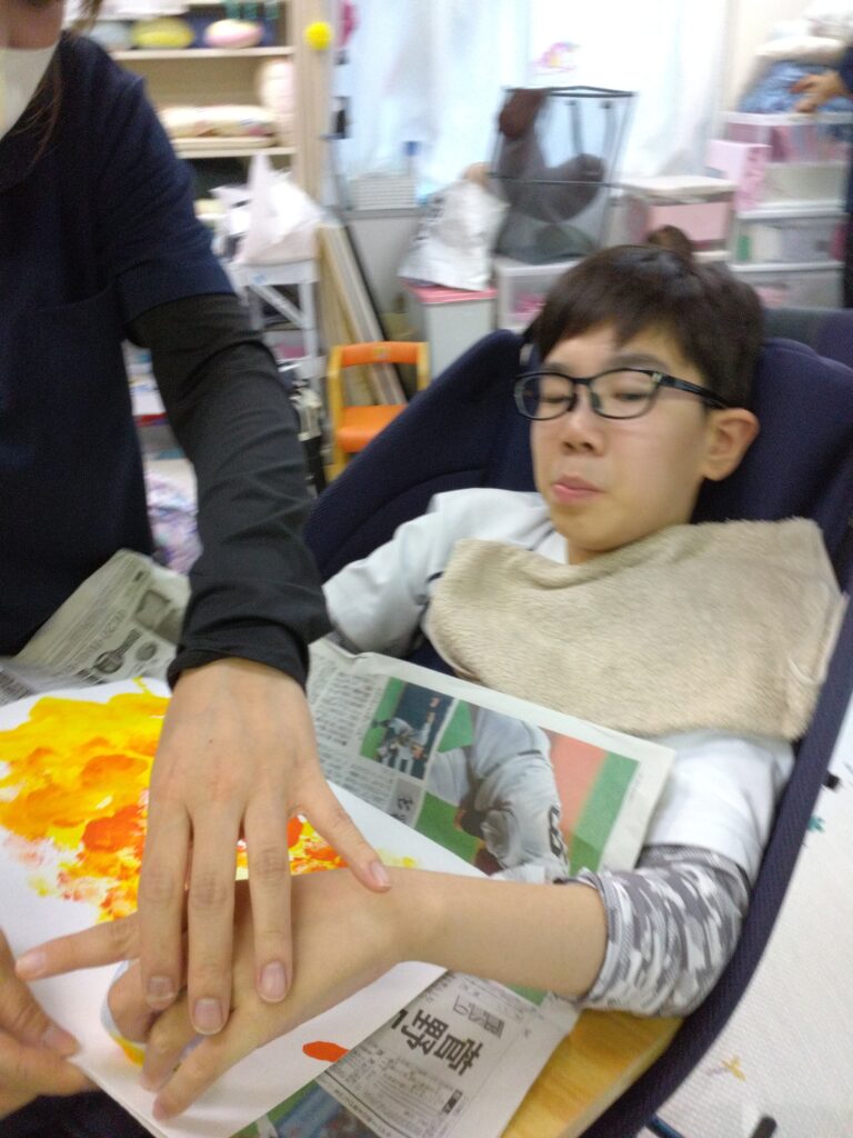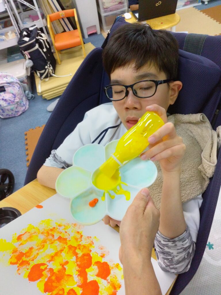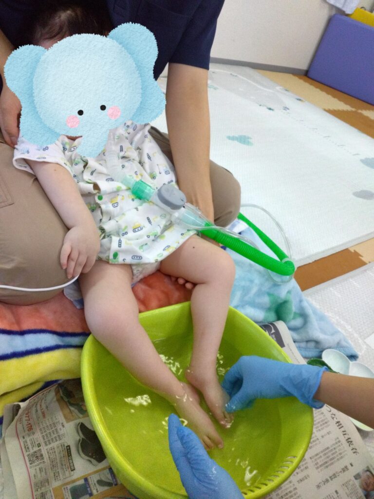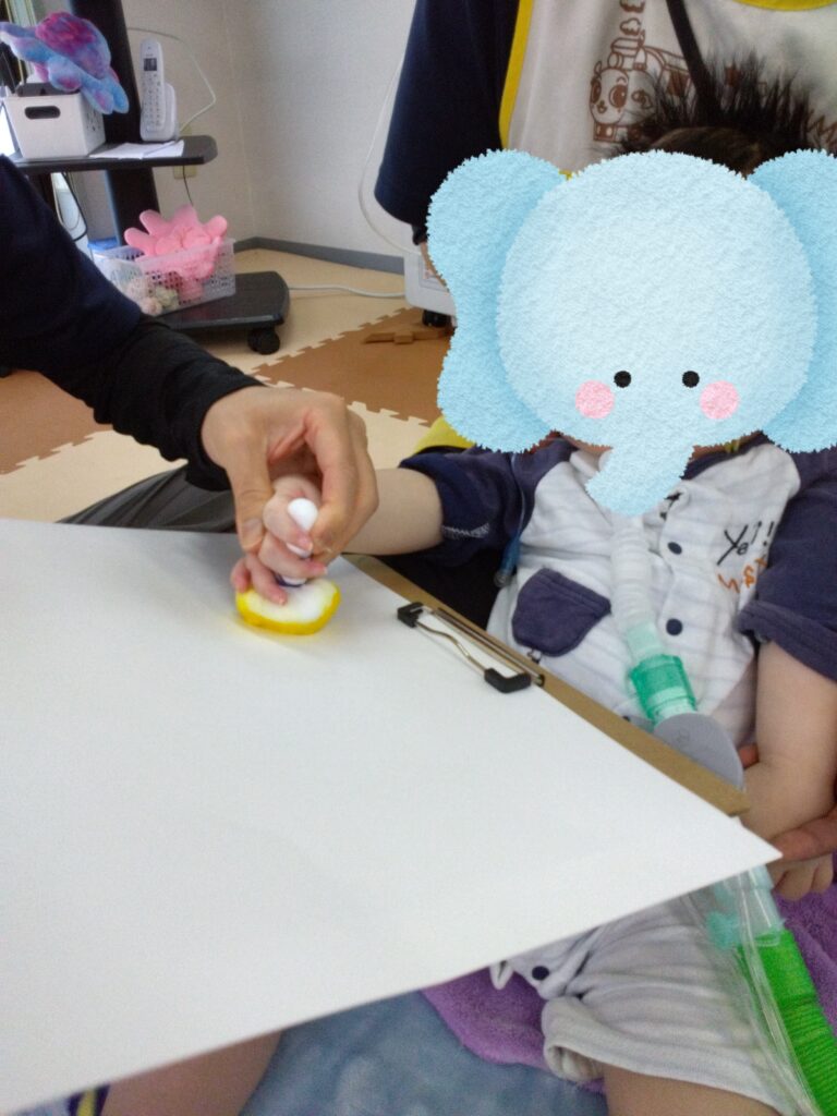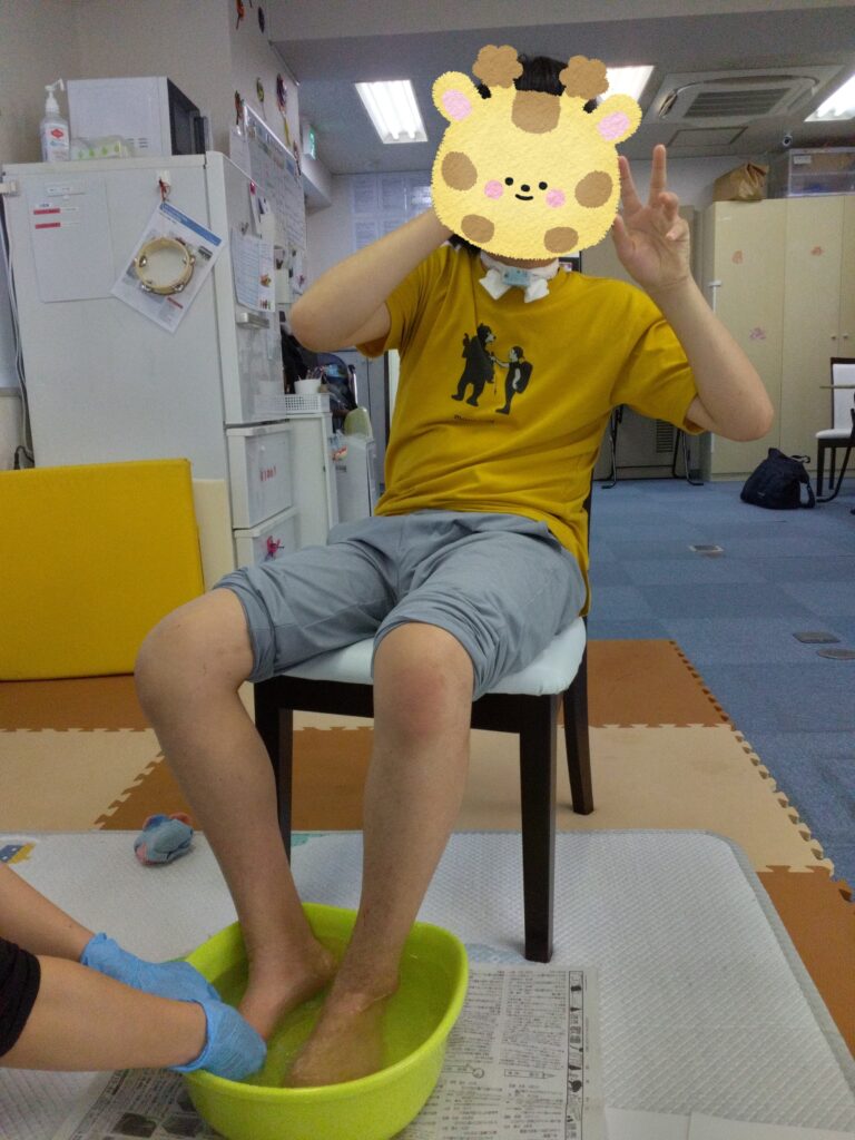 筆で足裏に絵の具を塗ると、「かゆかゆかゆ、、、」と言いながらくすぐったいのに耐える子や