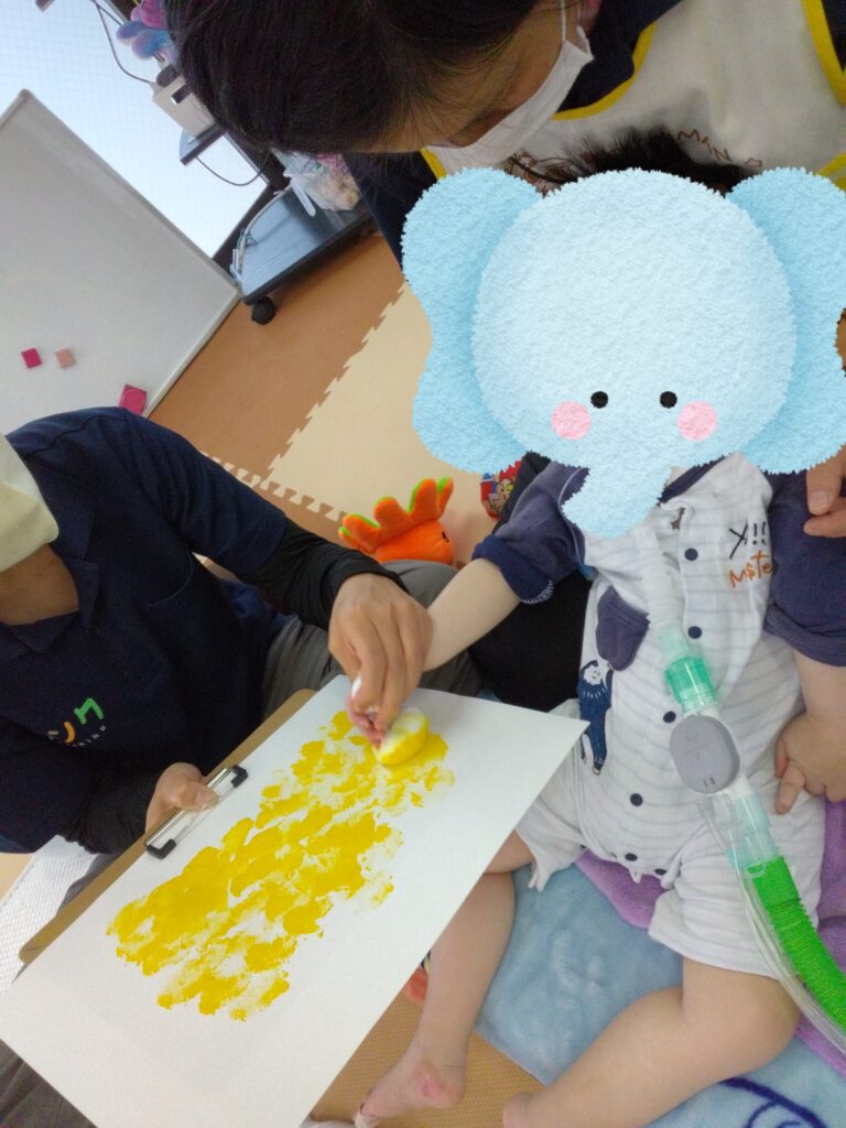 筆やタンポ・ペットボトルスタンプを使って画用紙塗り🔴🟠🟡🟢🔵🟣