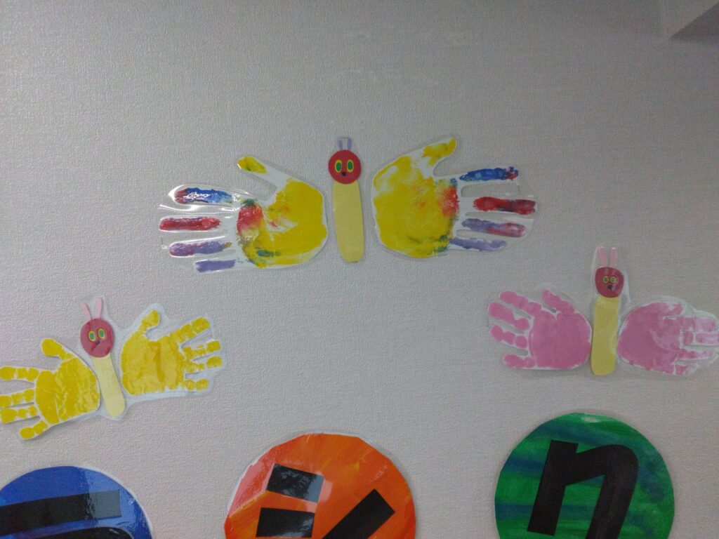 お次は、手形でちょうちょ、指スタンプで小さなあおむしを作りました✨