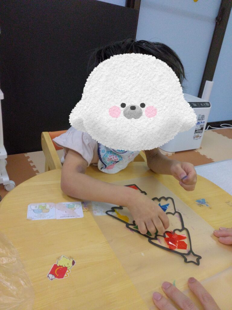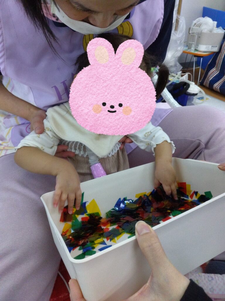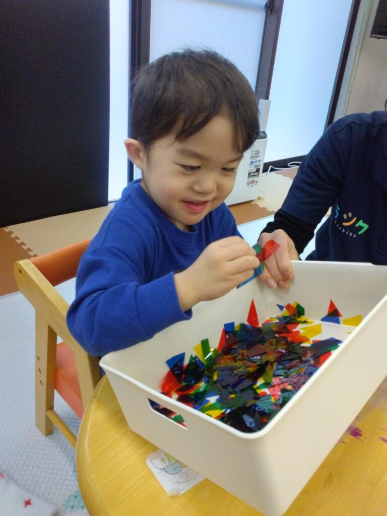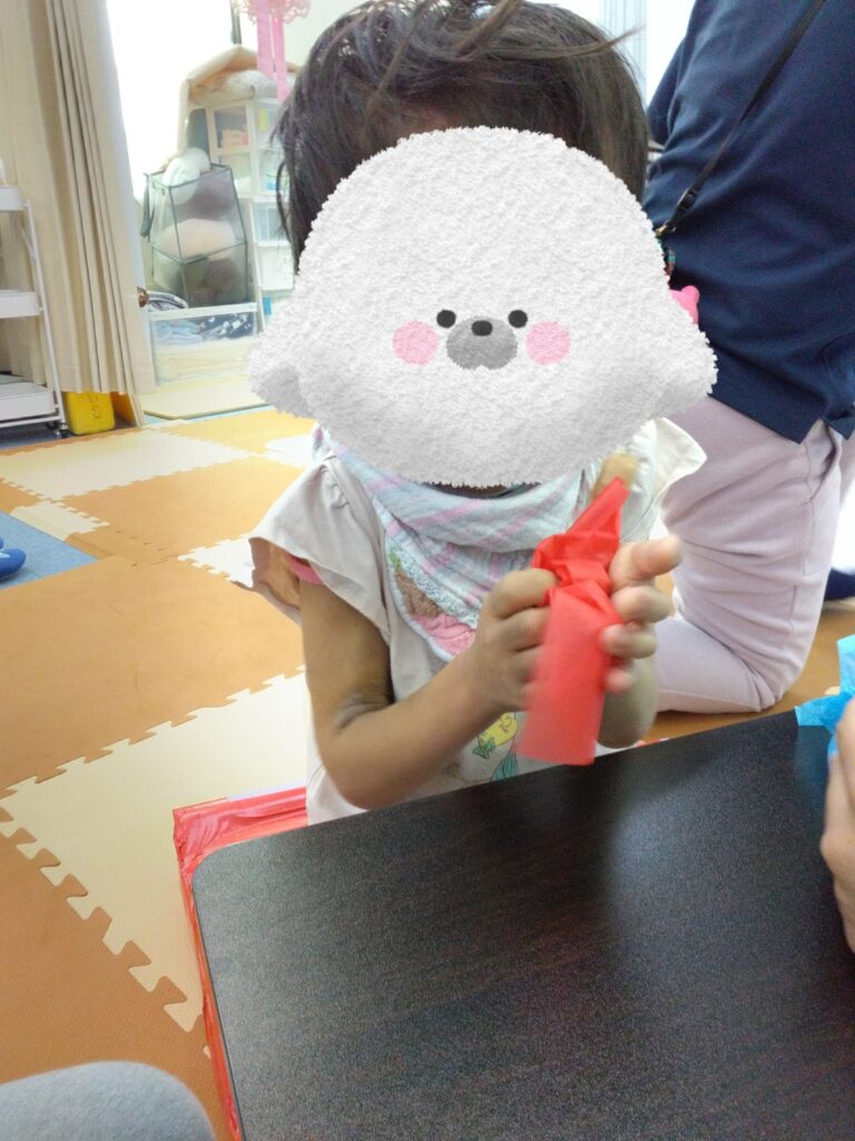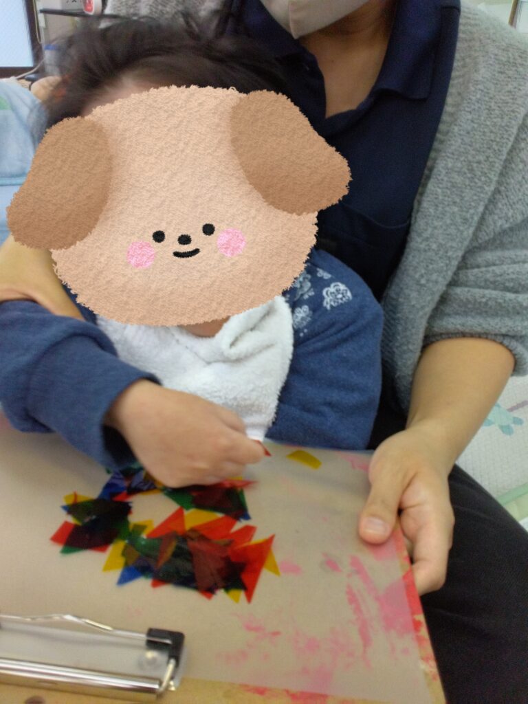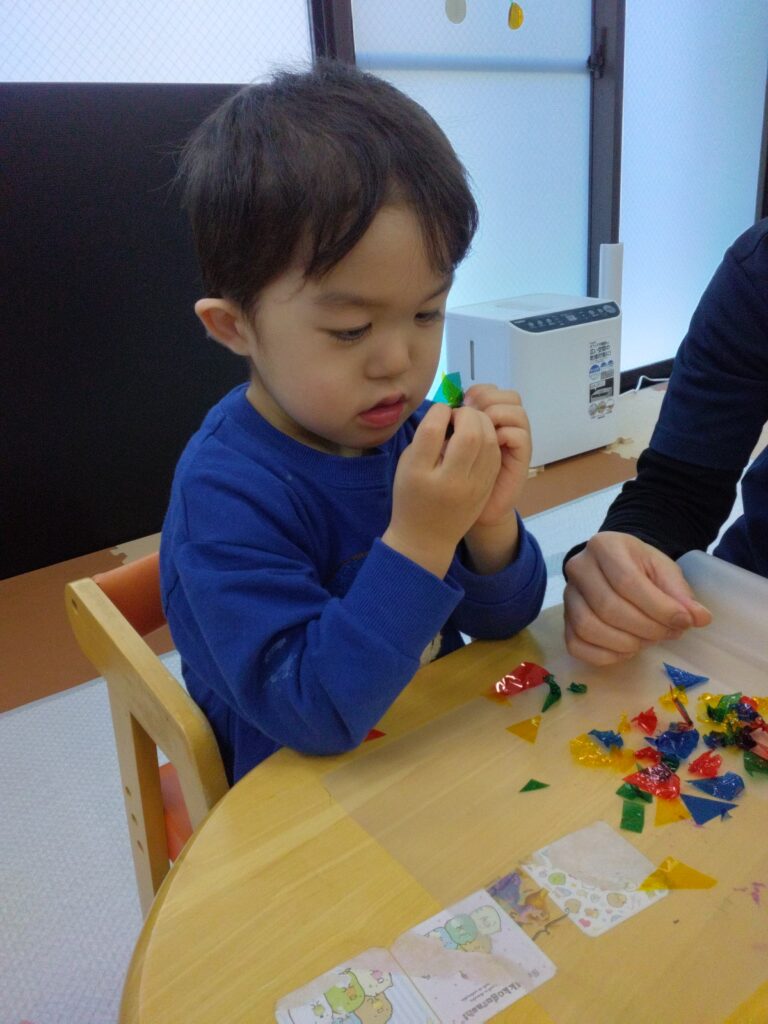 くしゃくしゃっとカラーセロハンが丸まる感触や音を楽しんでから乗せてみたり🤭