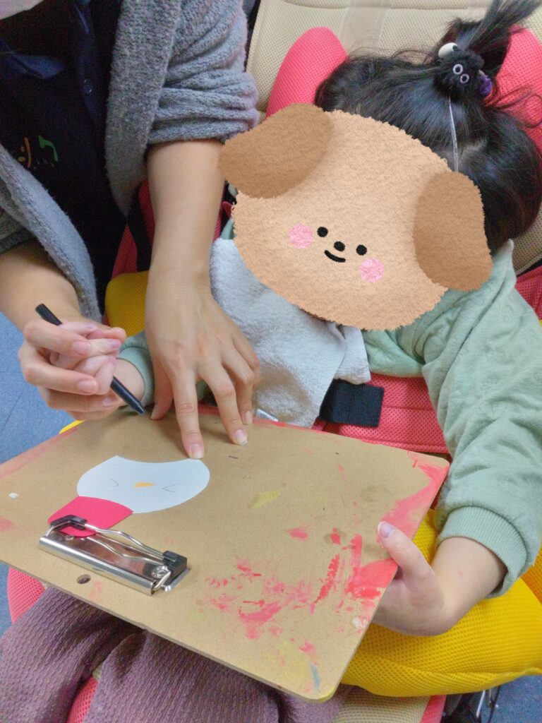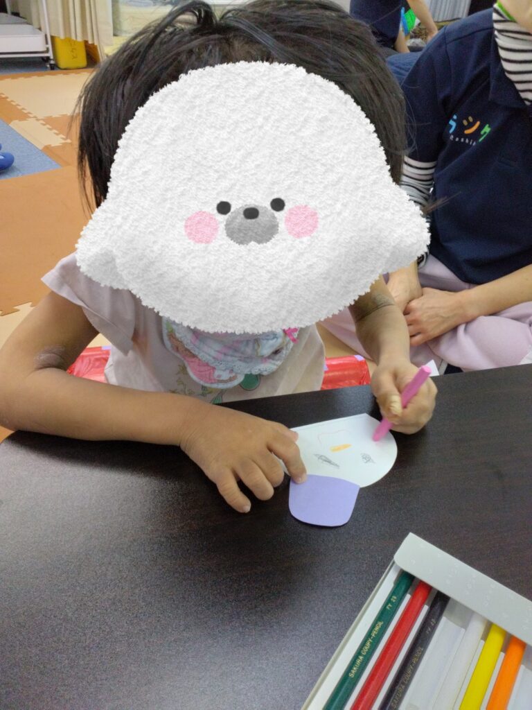 紙皿に花紙を貼り付けた後は、クーピーを持って顔を描きました😊
