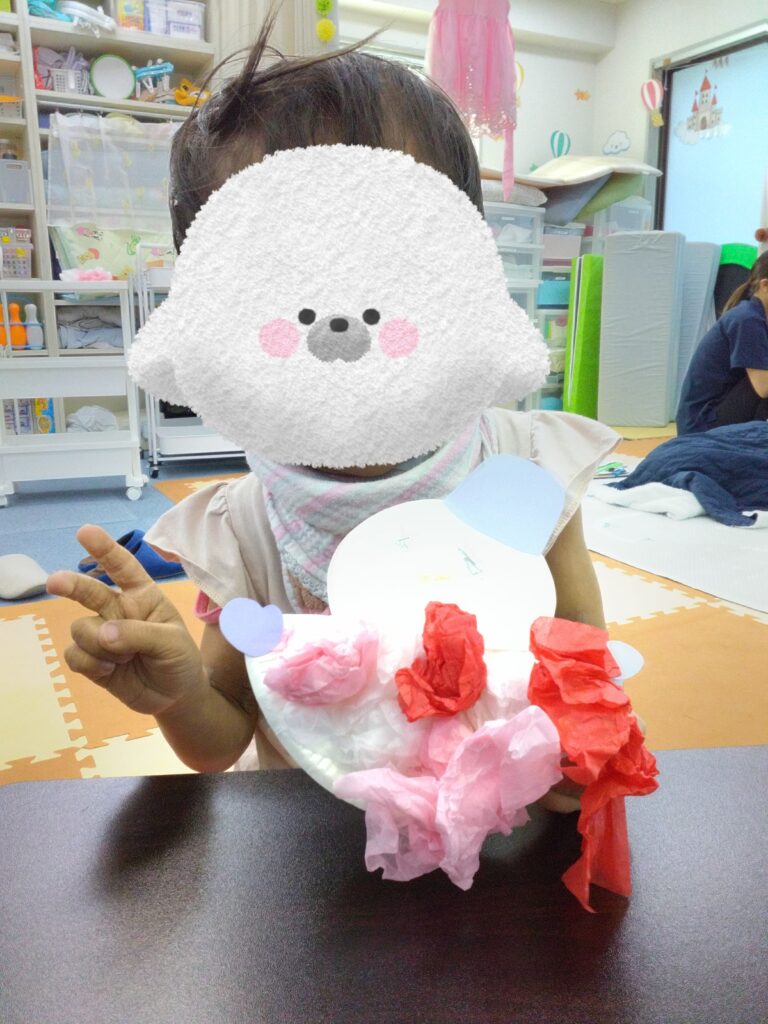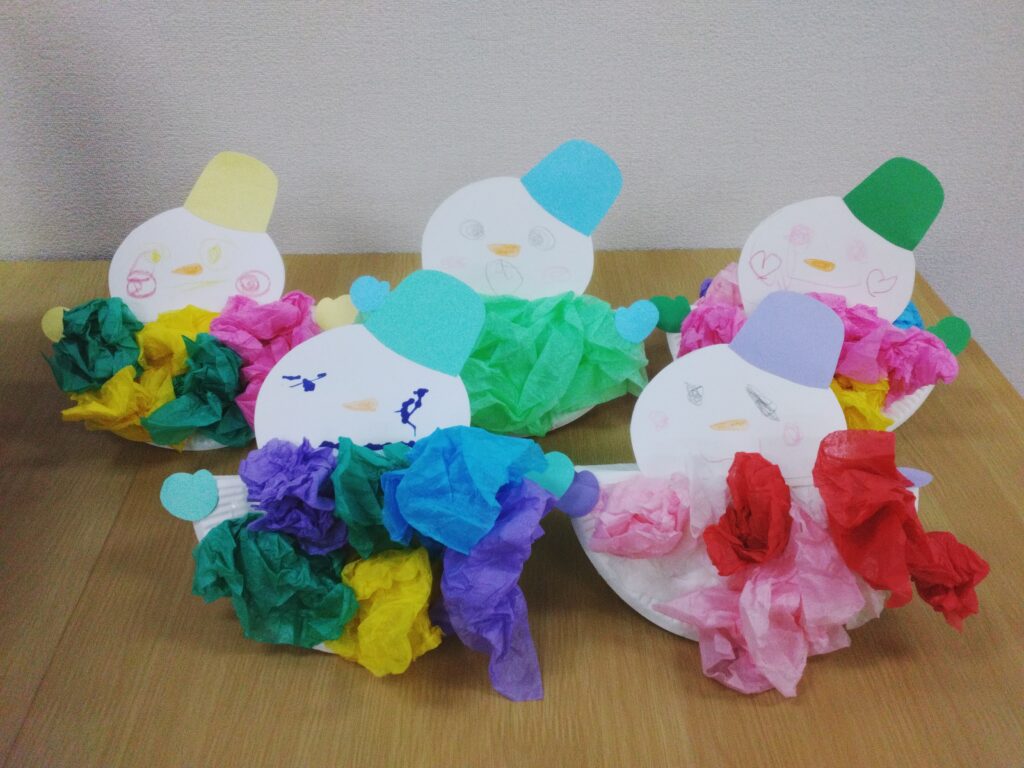 お次は、花紙を丸めて紙皿に乗せて雪だるまを作りました⛄💕❄️