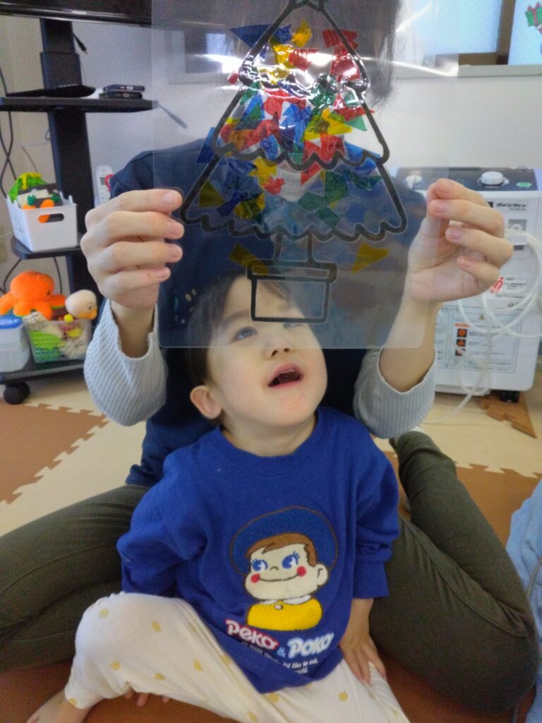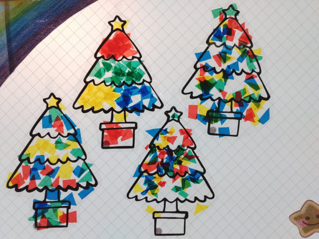 カラーセロハンを小さく切って、ツリー型の画用紙の上に乗せてラミネートすると、、、