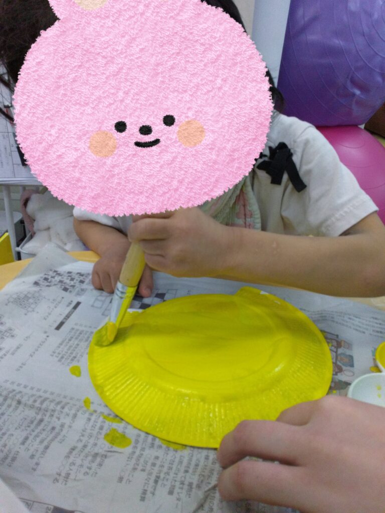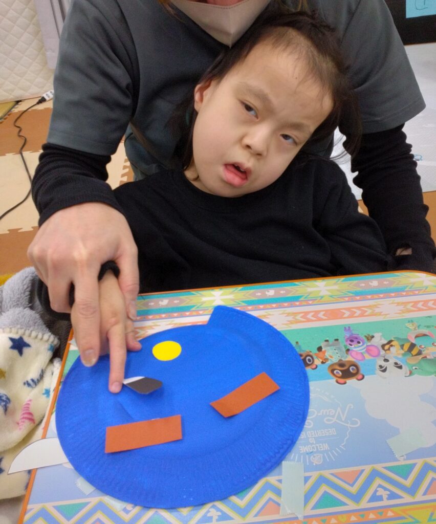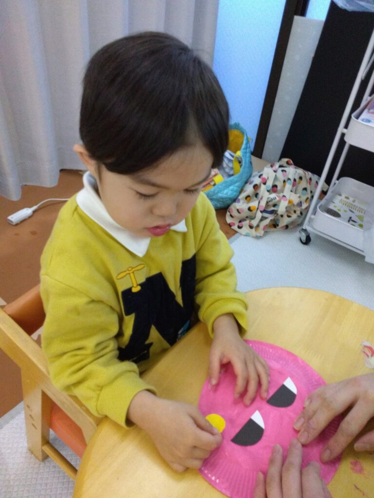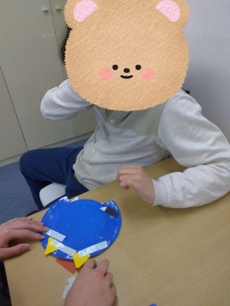 まず、色を塗った紙皿に、手探りで顔のパーツを貼っていきます…❕