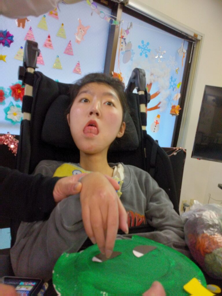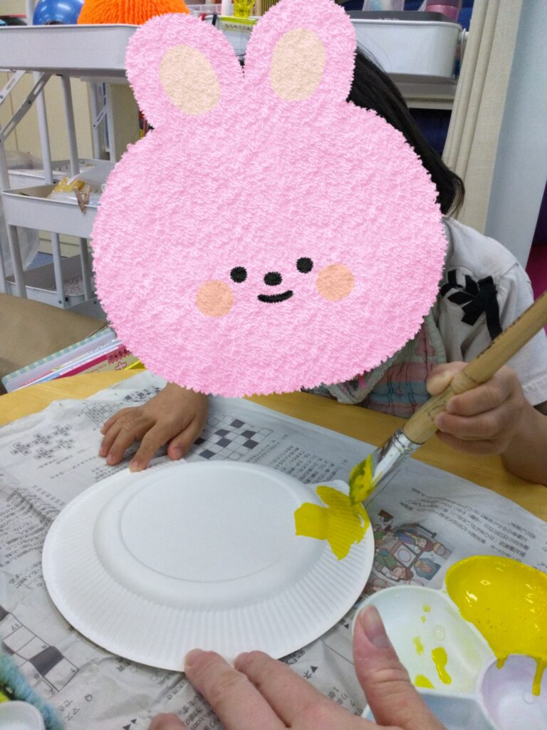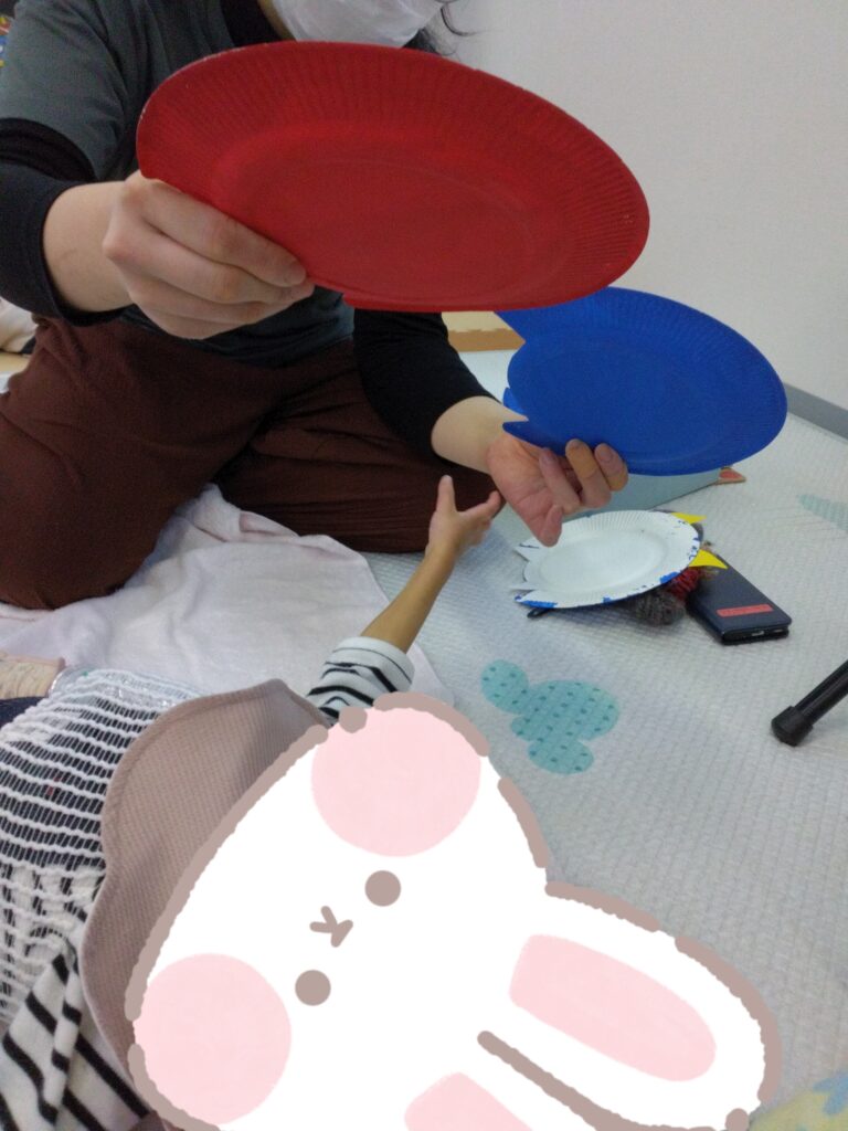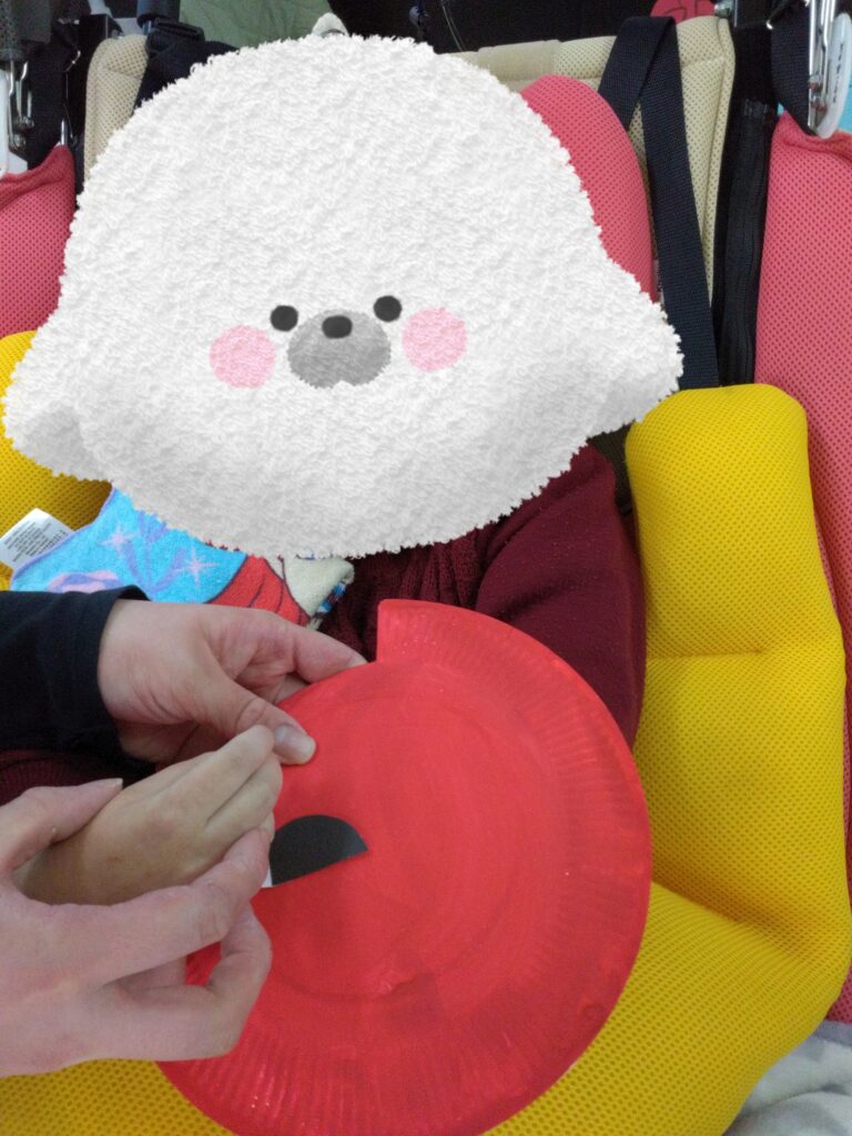 まず、色を塗った紙皿に、手探りで顔のパーツを貼っていきます…❕