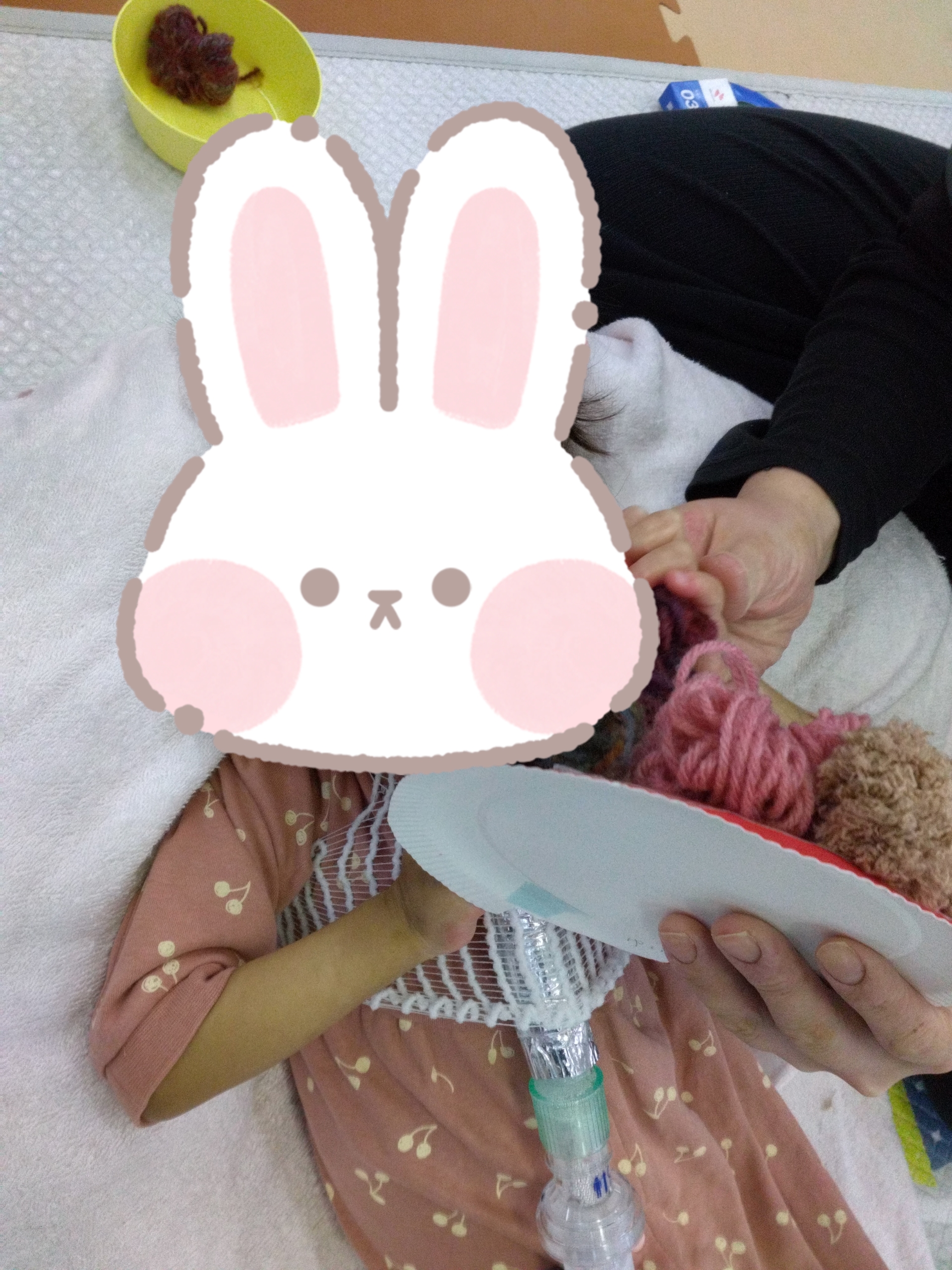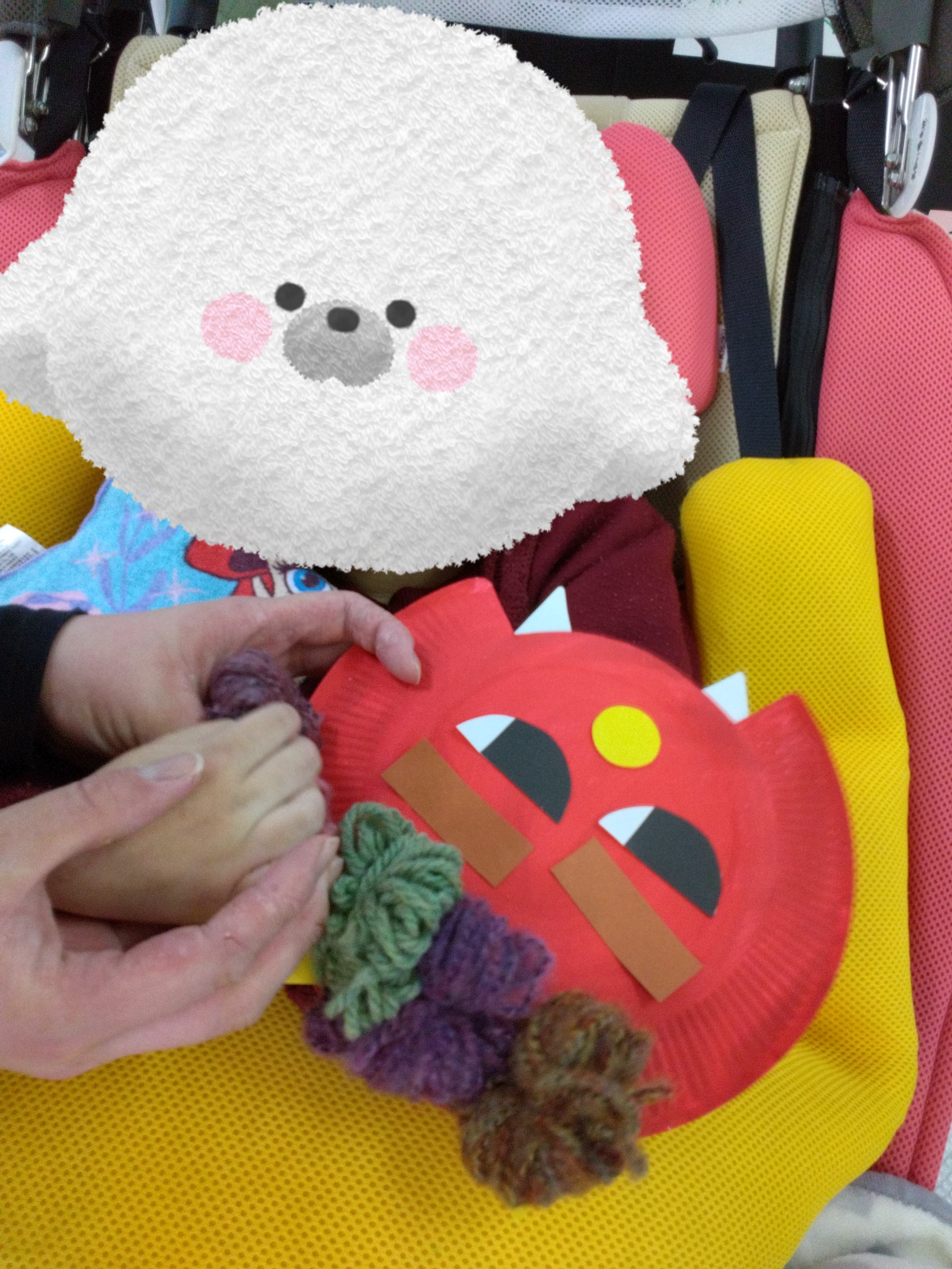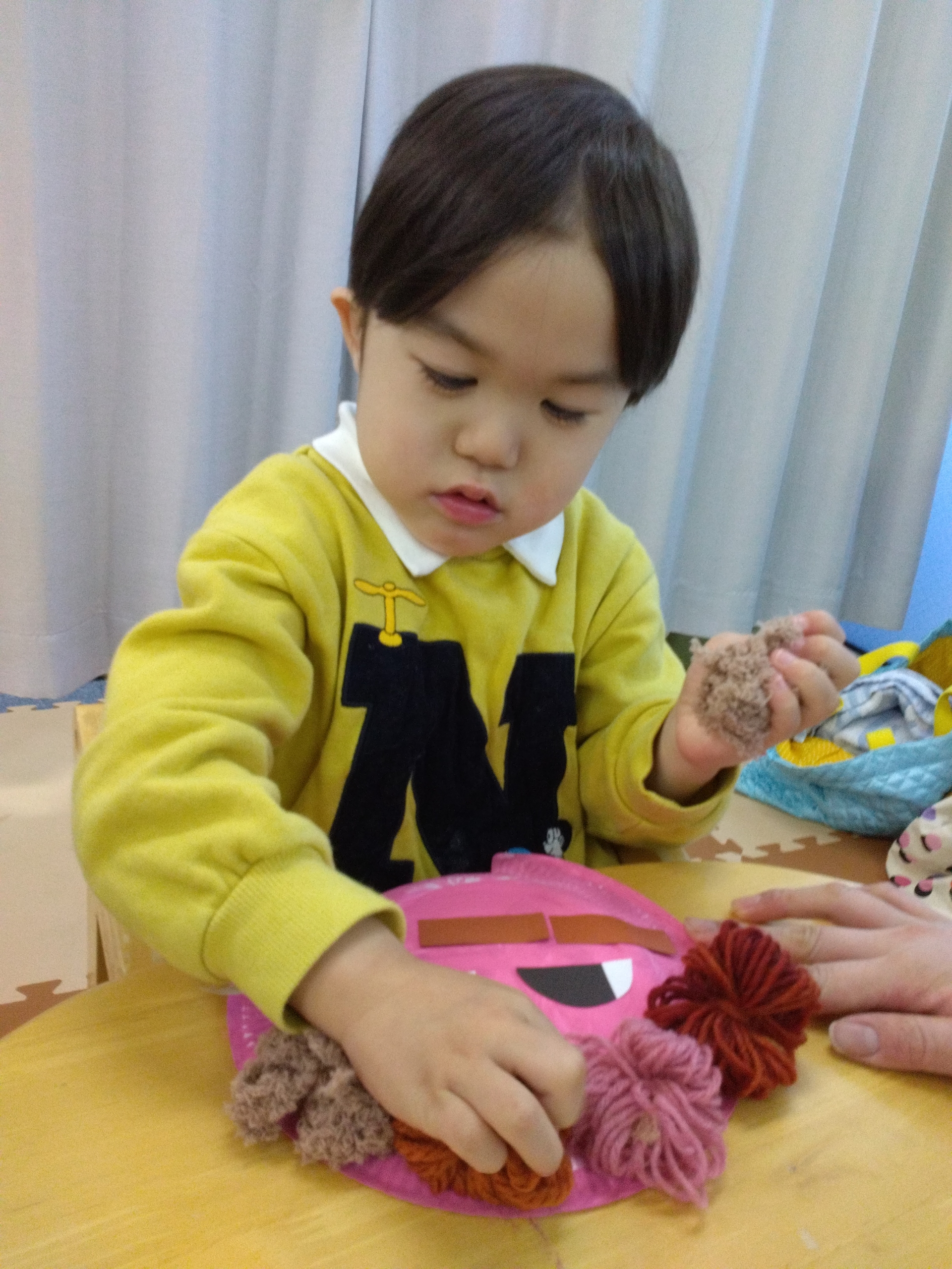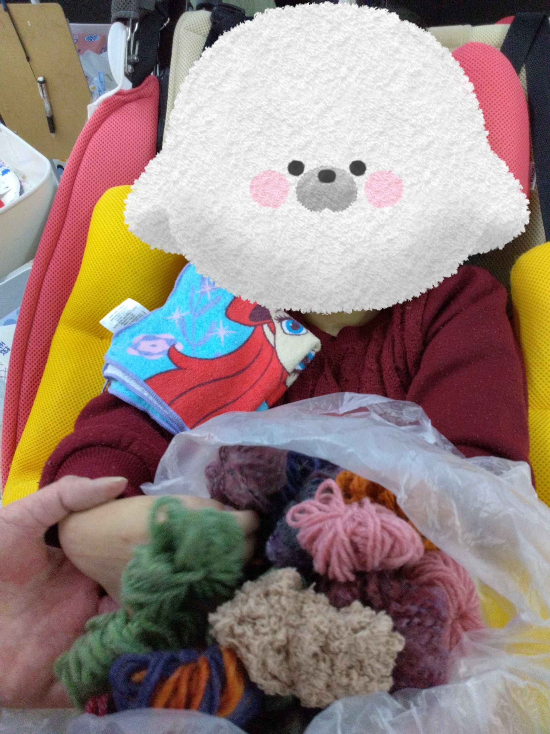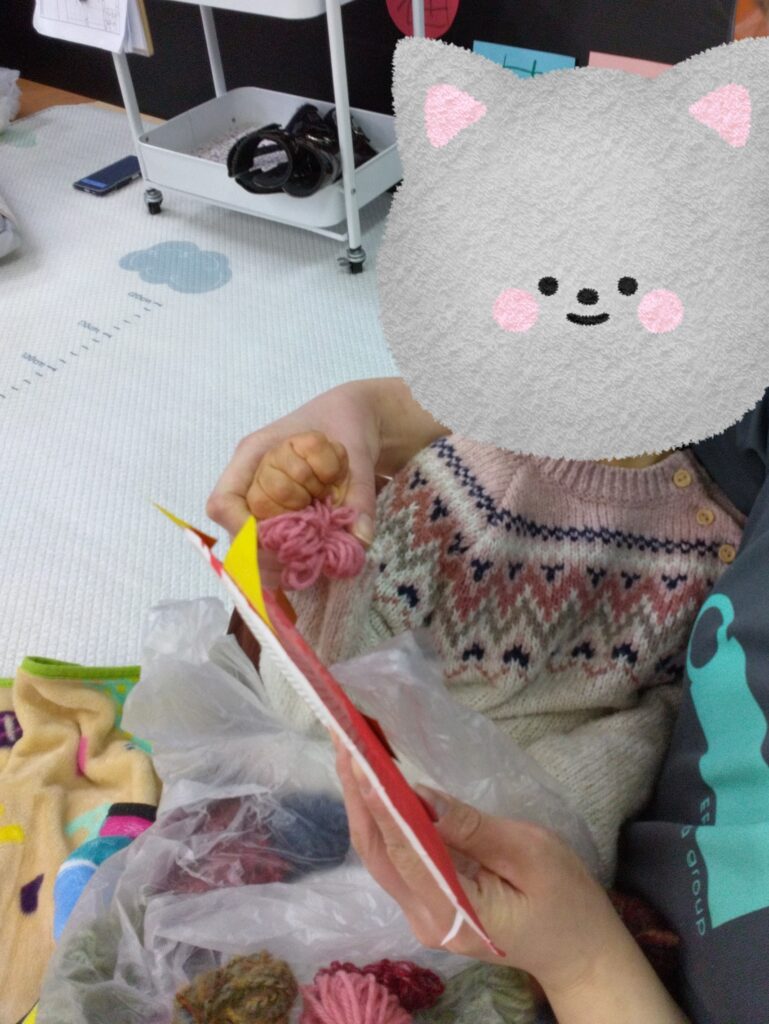 顔ができたら、髪の毛になる毛糸を見ないでつかみ取り💪🧶